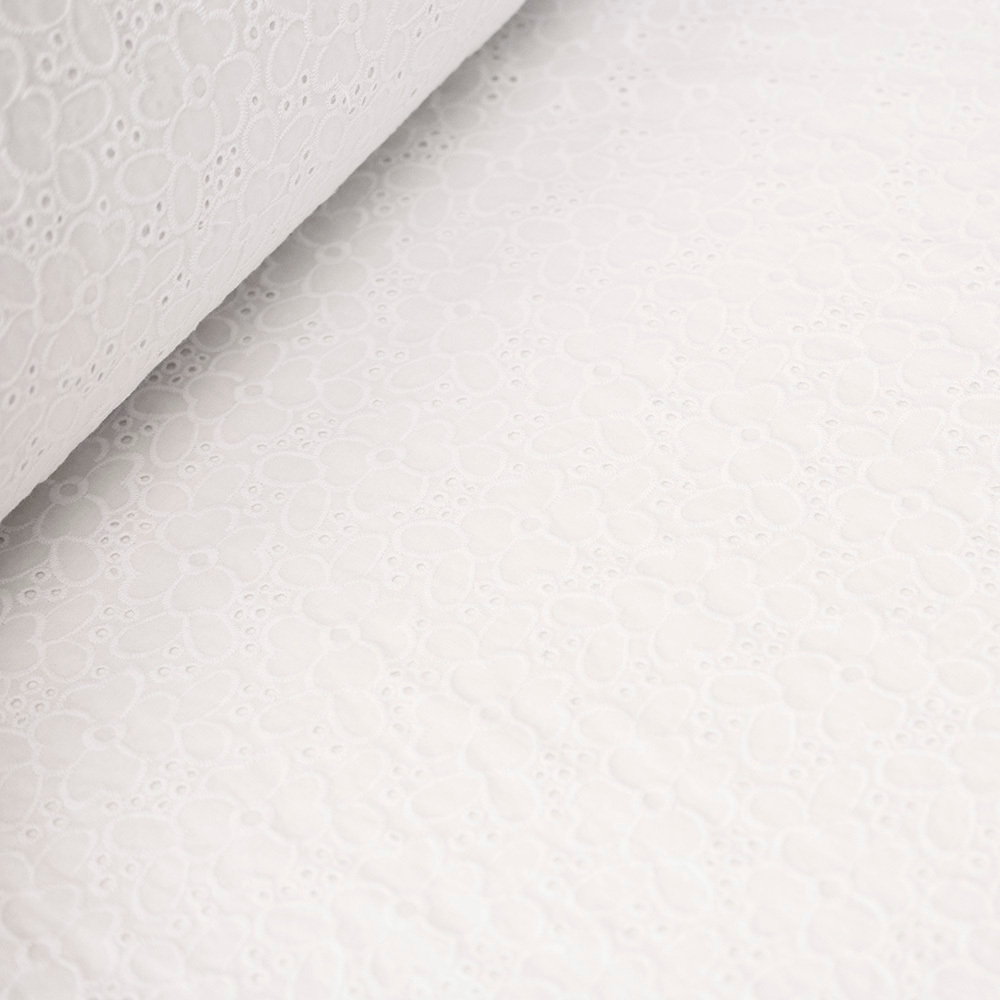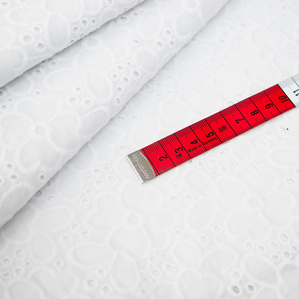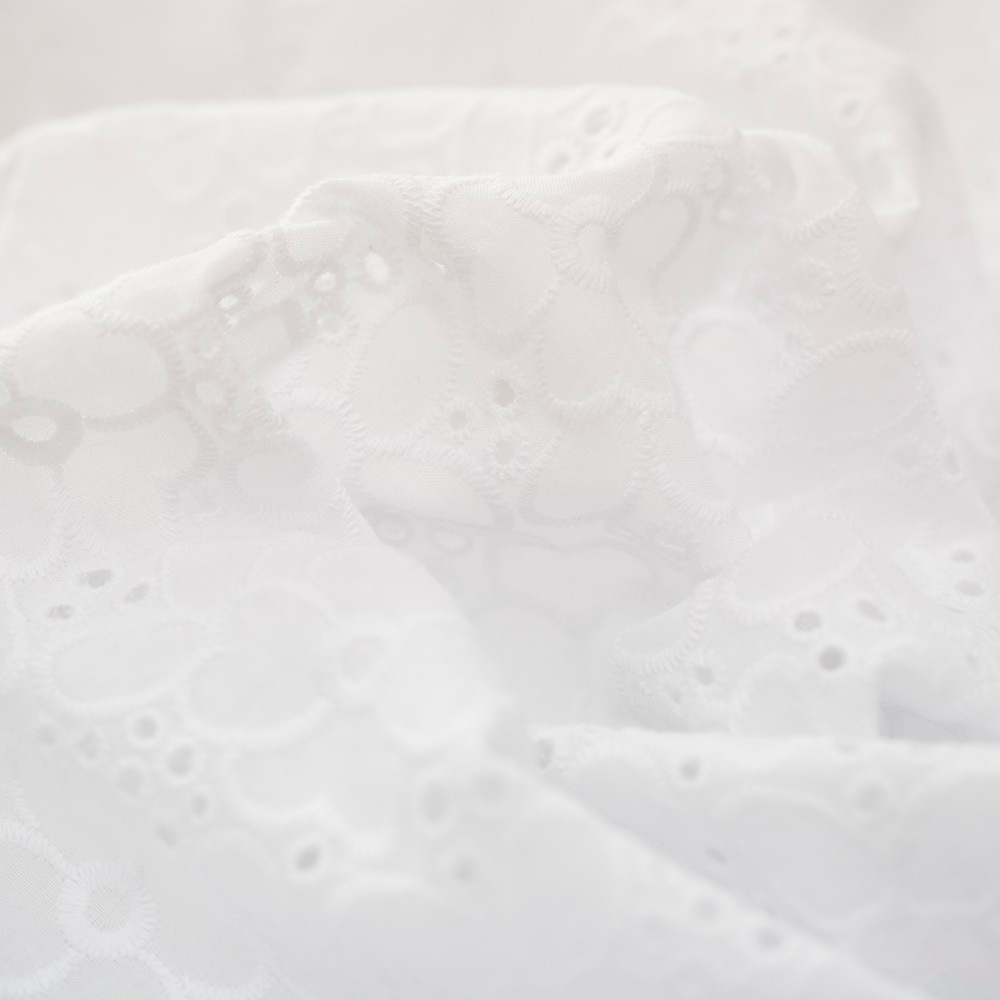 Bawełniany batyst o niskiej gramaturze i jednolitym, białym zabarwieniu. Wykonany z naturalnych włókien, charakteryzuje się rewelacyjną przepuszczalnością powietrza, jest bardzo przyjemny w dotyku. Doskonale sprawdzi się w szyciu wiosenno-letniej odzieży, świetnie nada się na bluzki, koszule topy, a także sukienki i spódnice. Głównym atutem tkaniny jest haftowany wzór, który tworzy na całości oryginalny, ażurowy deseń.