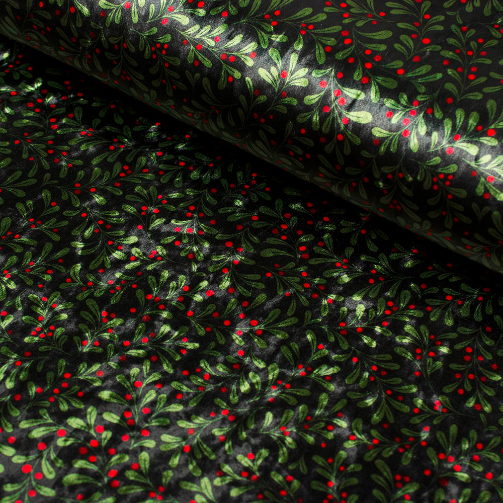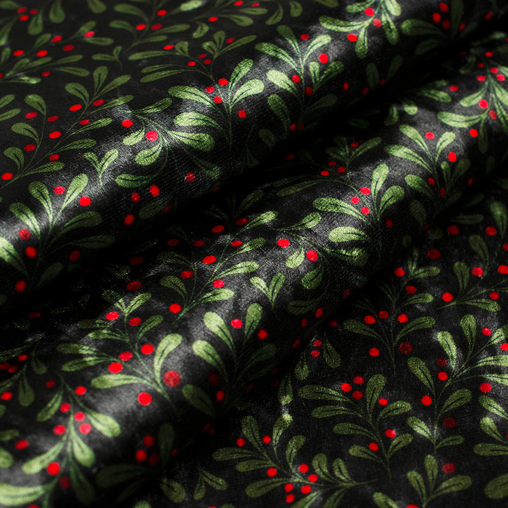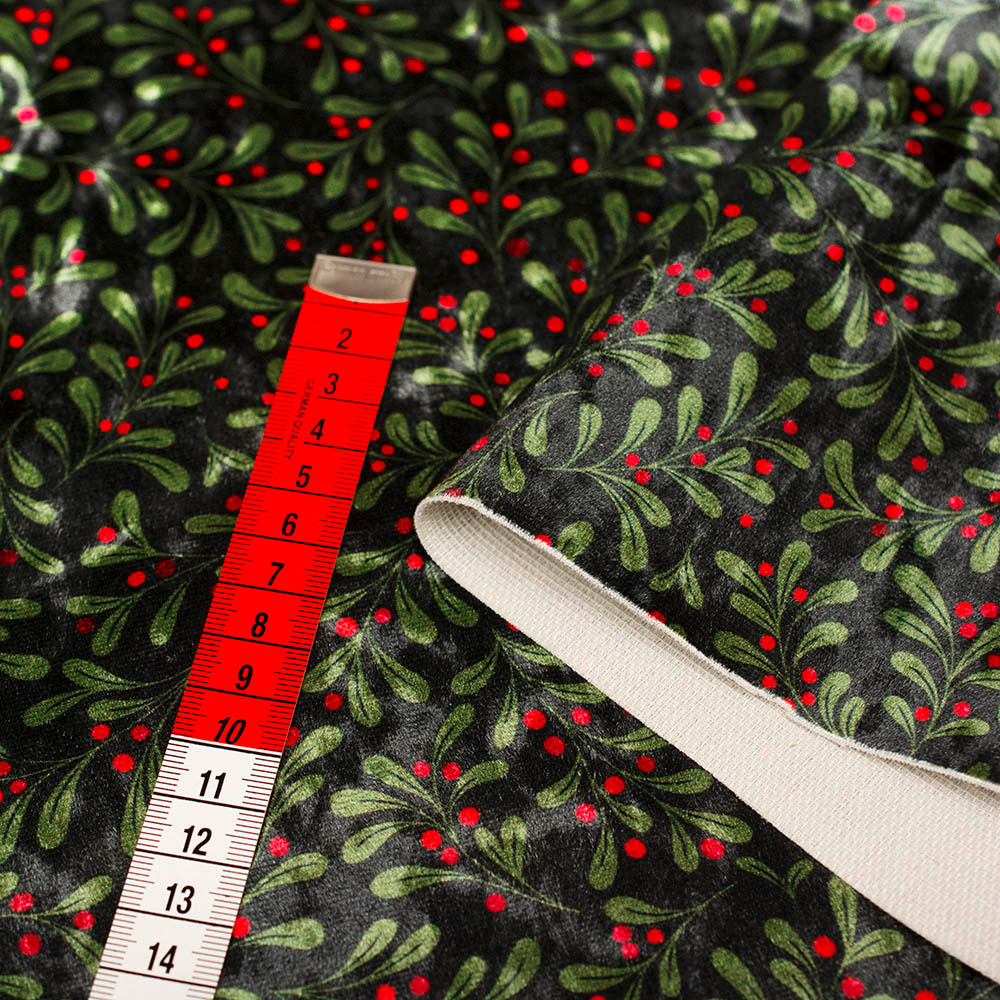 Dekoracyjna tkanina welurowa w pięknym świątecznym wzorze. Tkanina posiada charakterystyczną fakturę w postaci krótko strzyżonego włosa, nawiązującą do weluru. Jest bardzo przyjemna w dotyku układa się miękko. Idealnie sprawdzi się na zasłony, ozdobne poduchy czy narzuty na łóżko.
