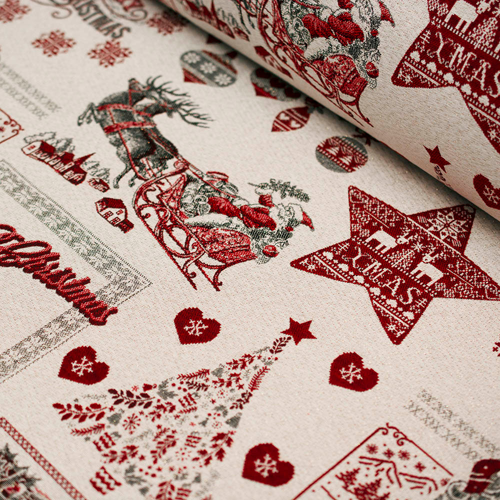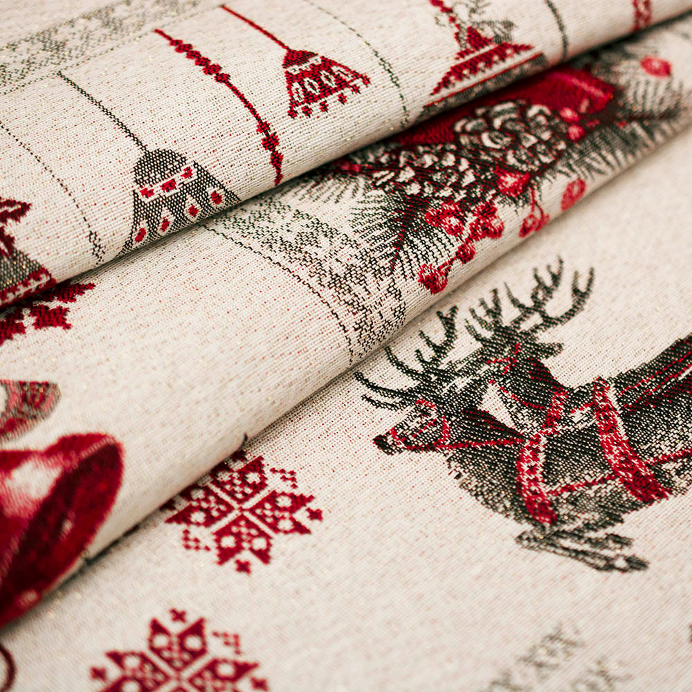 Wzorzysta tkanina dekoracyjna o pięknym, świątecznym deseniu to doskonały wybór do aranżacji wnętrz w okresie zimowym. Wykonana techniką żakardową, charakteryzuje się mocnym splotem oraz przyjemnie miękką fakturą, która dodaje tekstyliom elegancji i komfortu. Dzięki swojej wszechstronności świetnie sprawdzi się jako materiał na ozdobne poduszki, świąteczne obrusy czy bieżniki, wprowadzając do domu ciepły, uroczysty klimat.