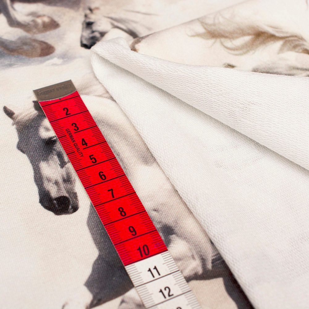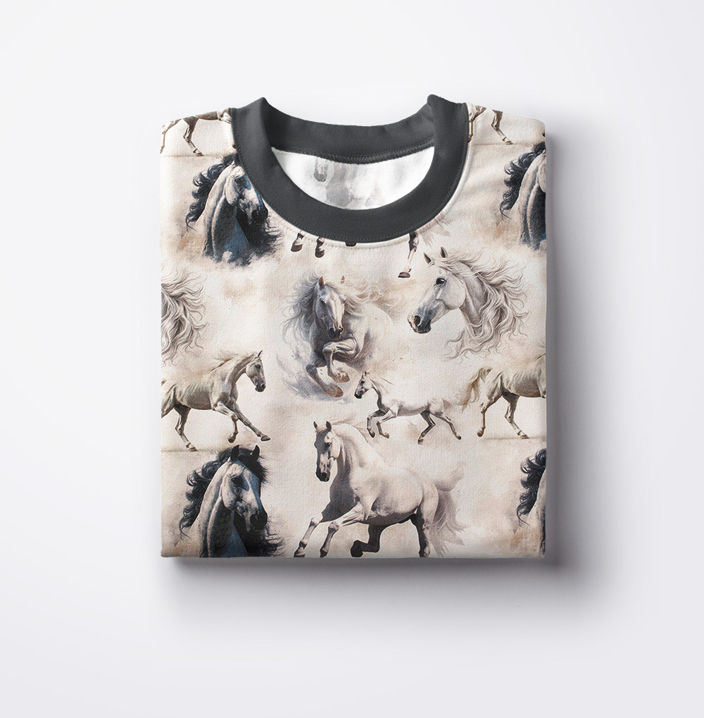 Dzianinę dodatkowo zdobi bardzo modny wzór wykonany za pomocą druku cyfrowego. Ta metoda pozwala na uzyskanie wielokolorowych deseni o trwałych i nasyconych barwach. Druk nie jest wyczuwalny w dotyku oraz nie wpływa na miękkość dzianiny.