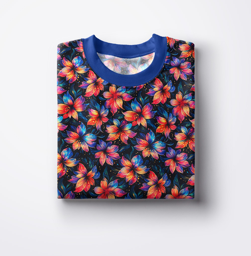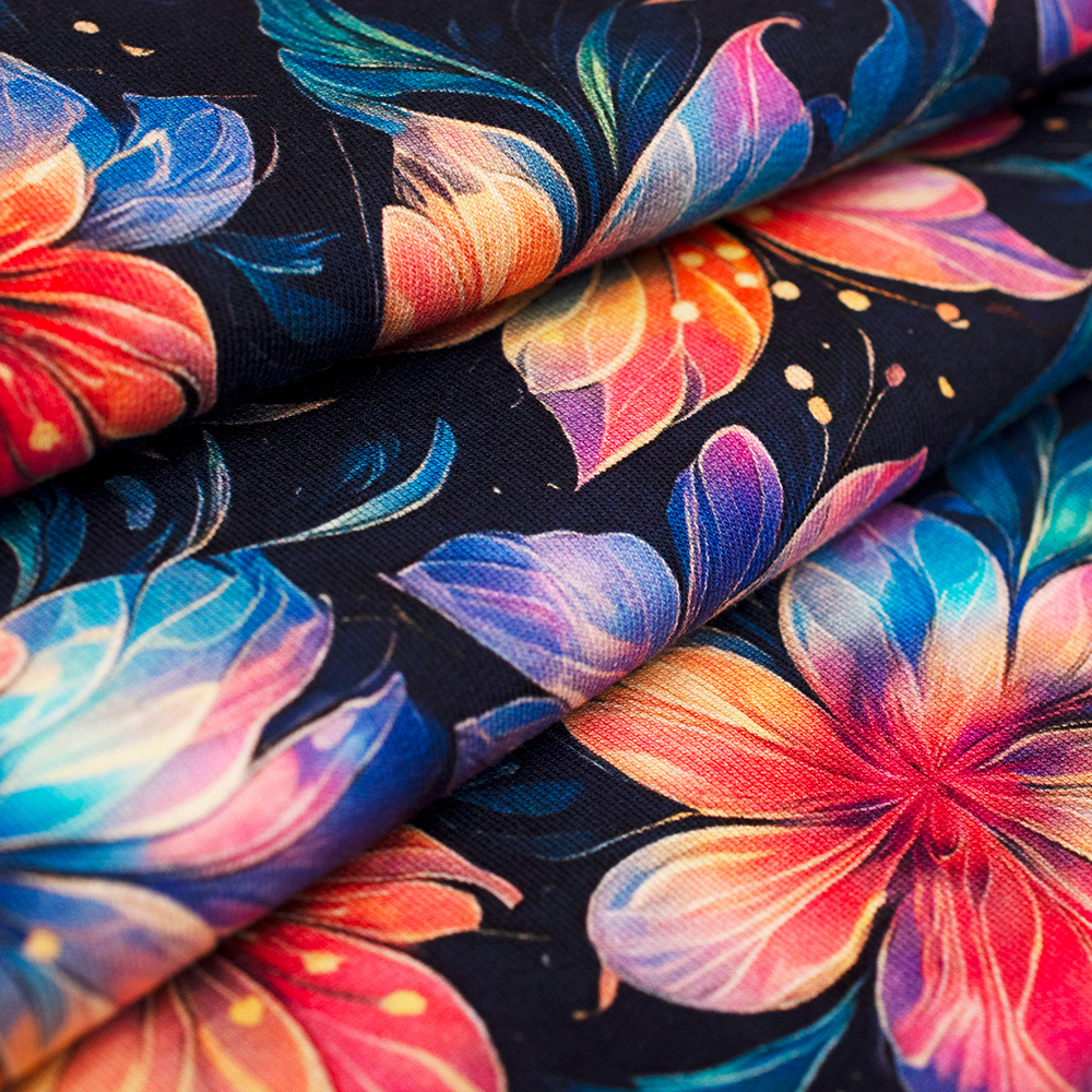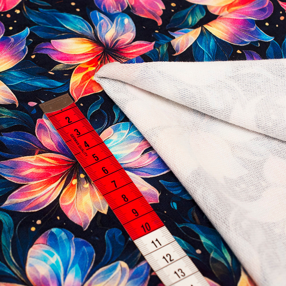 Dzianinę dodatkowo zdobi bardzo modny wzór wykonany za pomocą druku cyfrowego. Ta metoda pozwala na uzyskanie wielokolorowych deseni o trwałych i nasyconych barwach. Druk nie jest wyczuwalny w dotyku oraz nie wpływa na miękkość dzianiny.