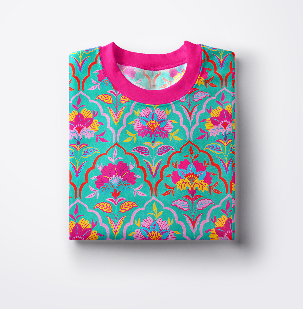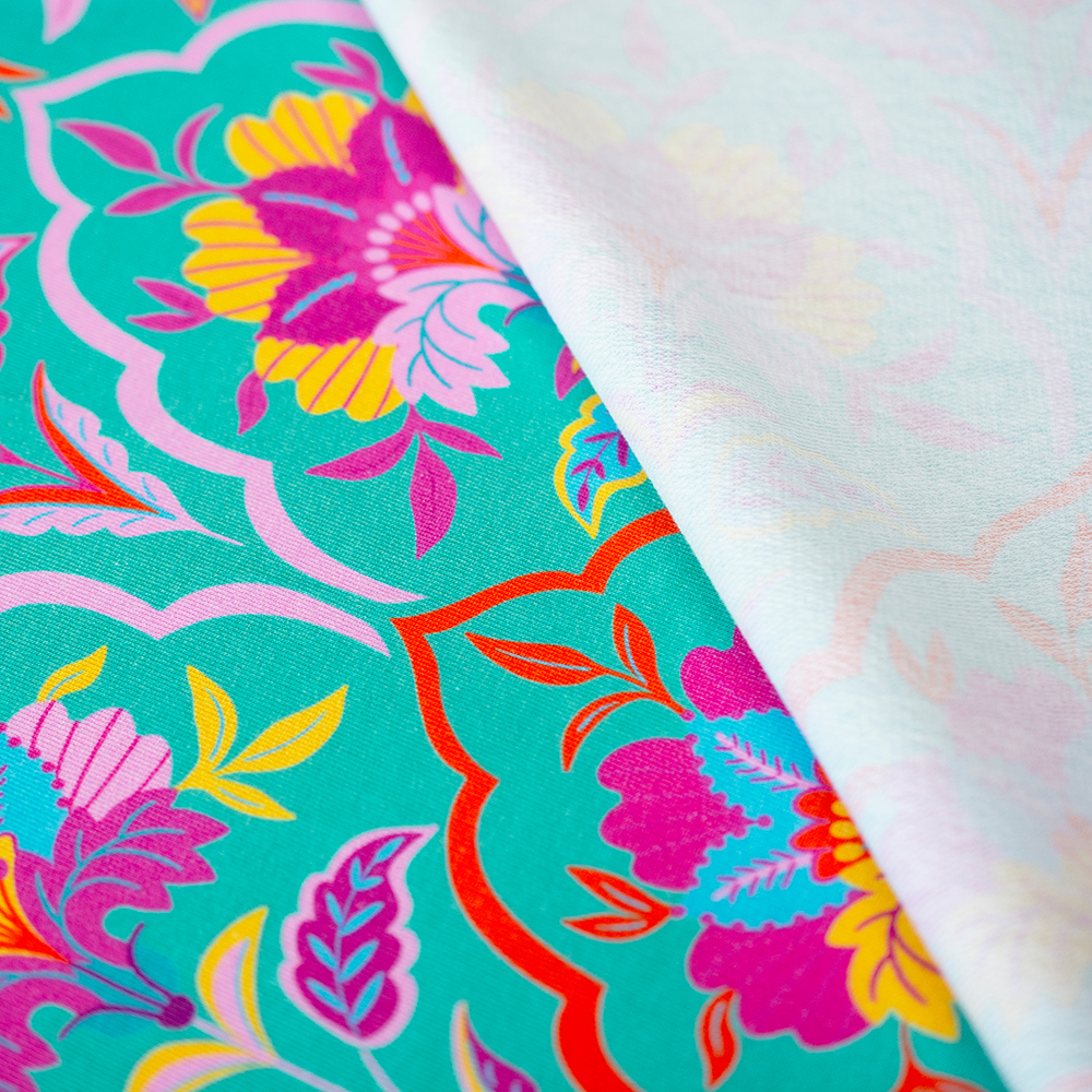 Dzianinę dodatkowo zdobi bardzo modny wzór wykonany za pomocą druku cyfrowego. Ta metoda pozwala na uzyskanie wielokolorowych deseni o trwałych i nasyconych barwach. Druk nie jest wyczuwalny w dotyku oraz nie wpływa na miękkość dzianiny.