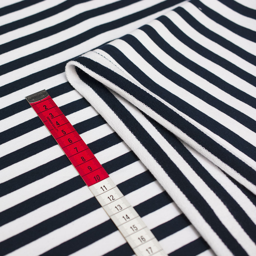Bawełniana dzianina dresowa o spodzie pętelkowym w bardzo modnym w tym sezonie wzorze w paski.