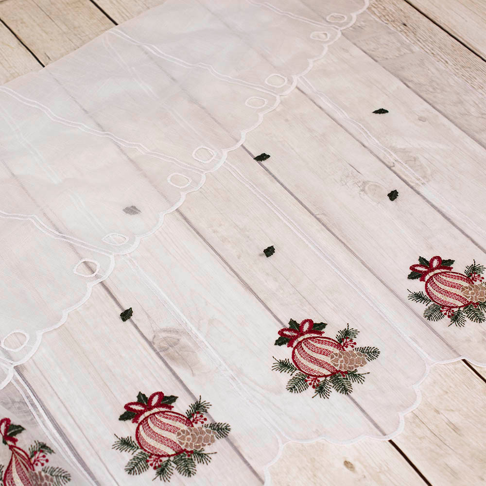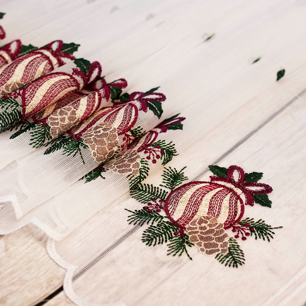 Zazdrostka typu żakardowego, krótka firanka z motywem świątecznym, która doskonale sprawdzi się jako dekoracja okienna w okresie zimowym. Można ją zawiesić na prosto lub przymarszczyć według własnych upodobań, dopasowując do stylu wnętrza. Zazdrostka posiada fabryczne otwory, dzięki którym łatwo zawiesić ją na karniszu, co zapewnia szybki i wygodny montaż. Sprzedawana w formie panelowej, nie wymaga obrębiania, co dodatkowo ułatwia jej zastosowanie w dekoracji okna. Dostępna w różnych długościach, pozwala na swobodne dopasowanie do rozmiaru okna i indywidualnej koncepcji aranżacyjnej.