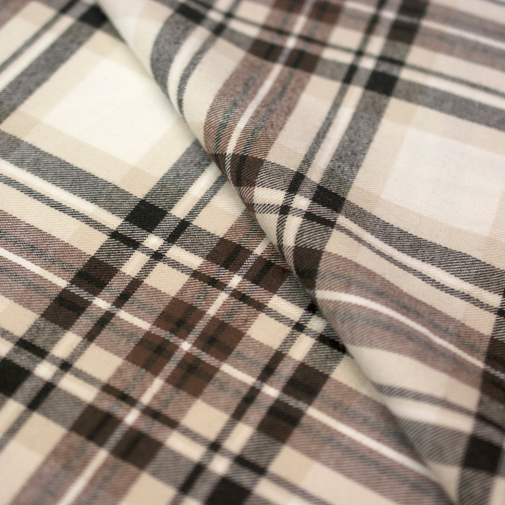 Miękka flanela wykonana z połączenia włókien bawełnianych i syntetycznych, w modnym wzorze kraty.