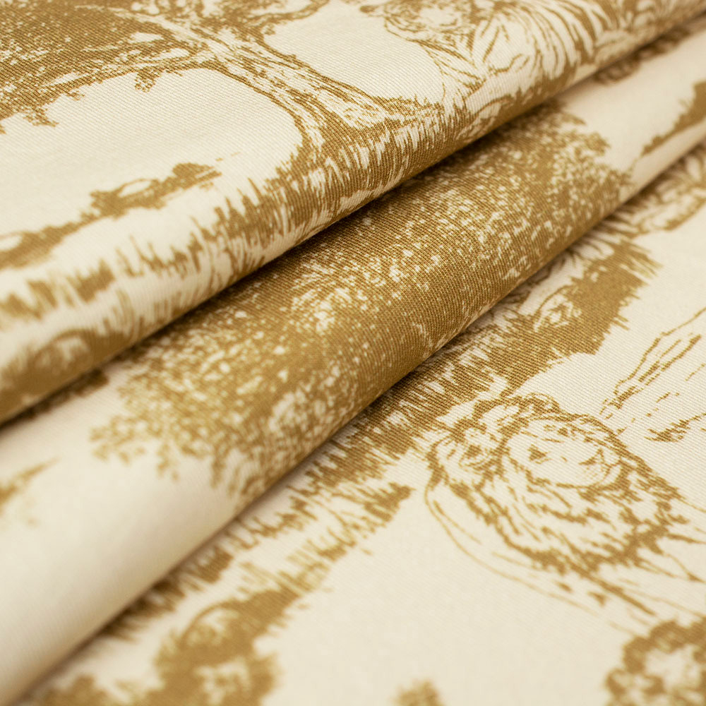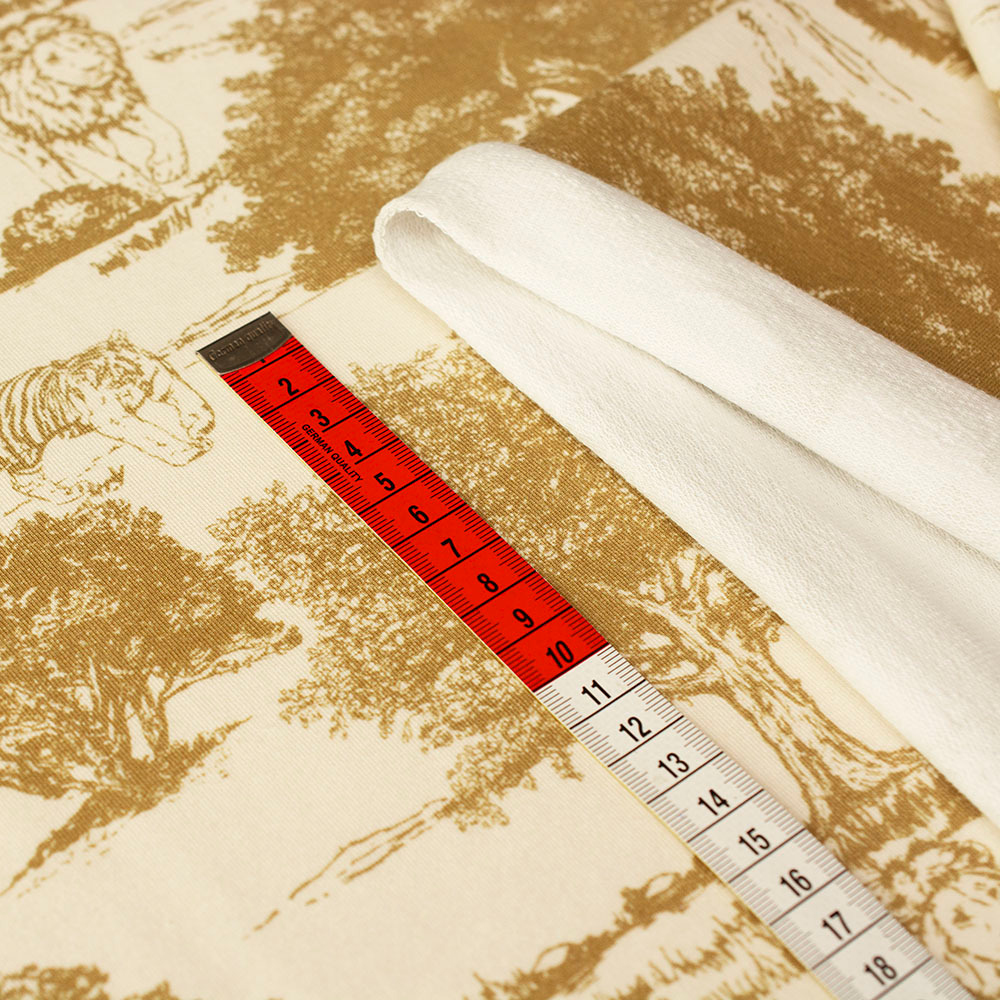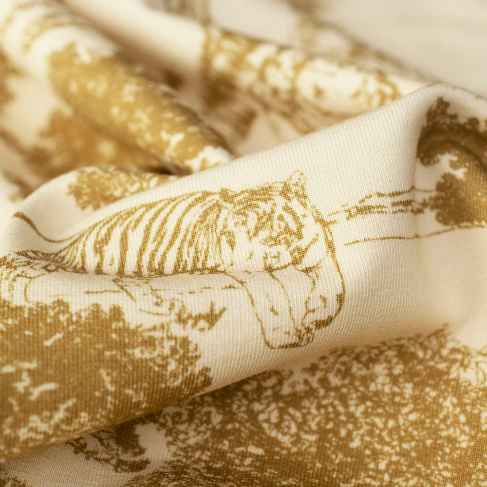 Dzianinę dodatkowo zdobi bardzo modny wzór wykonany za pomocą druku cyfrowego. Ta metoda pozwala na uzyskanie wielokolorowych deseni o trwałych i nasyconych barwach. Druk nie jest wyczuwalny w dotyku oraz nie wpływa na miękkość dzianiny.