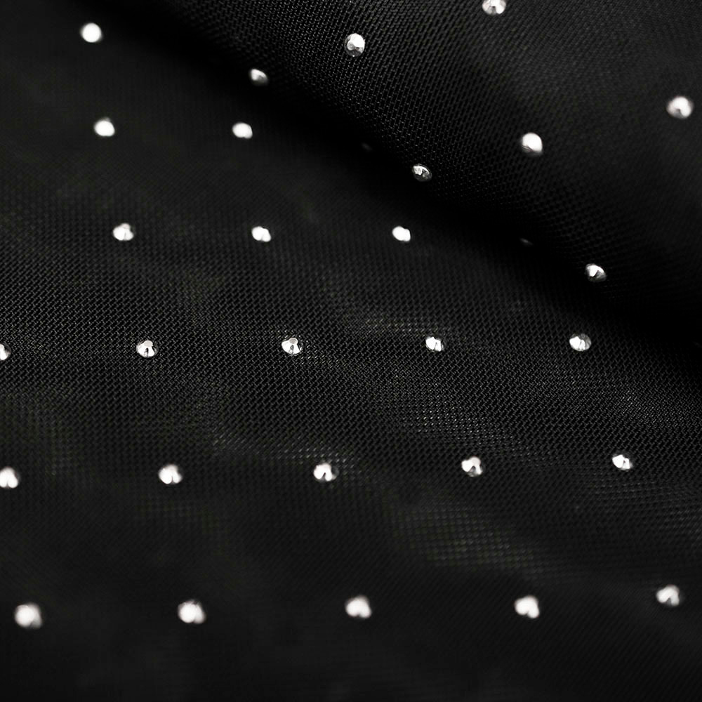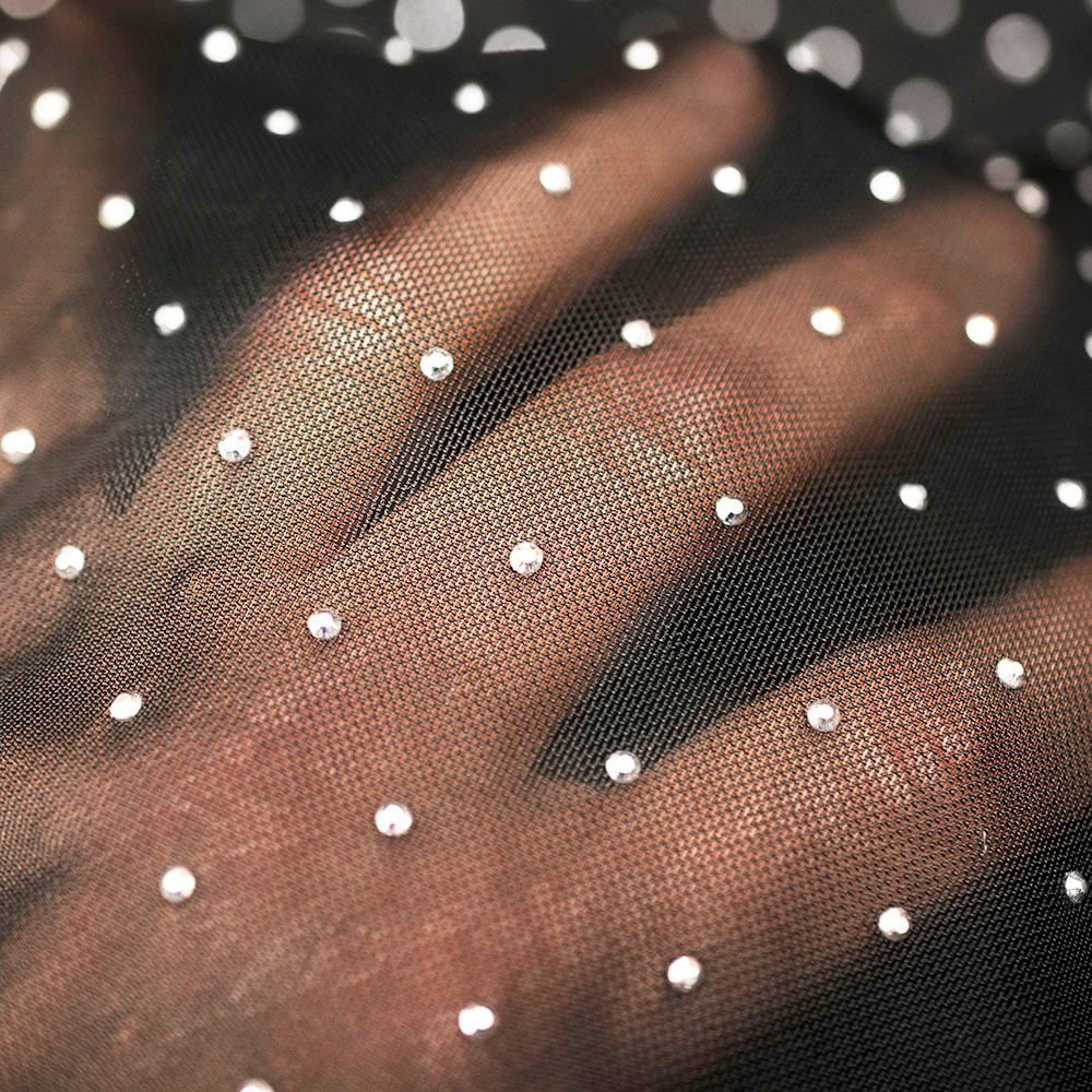 Siatka elastyczna Diamond odobiona drobnymi jetami. Układa się zwiewnie, posiada delikatnie śliską fakturę oraz niewielkieoczka. Świetnie sprawdza się zarówno jako element uzupełniający do uszytej odzieży, a także jako samodzielna kreacja, np. sukienka lub bluzka.