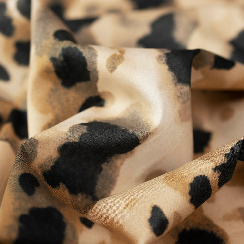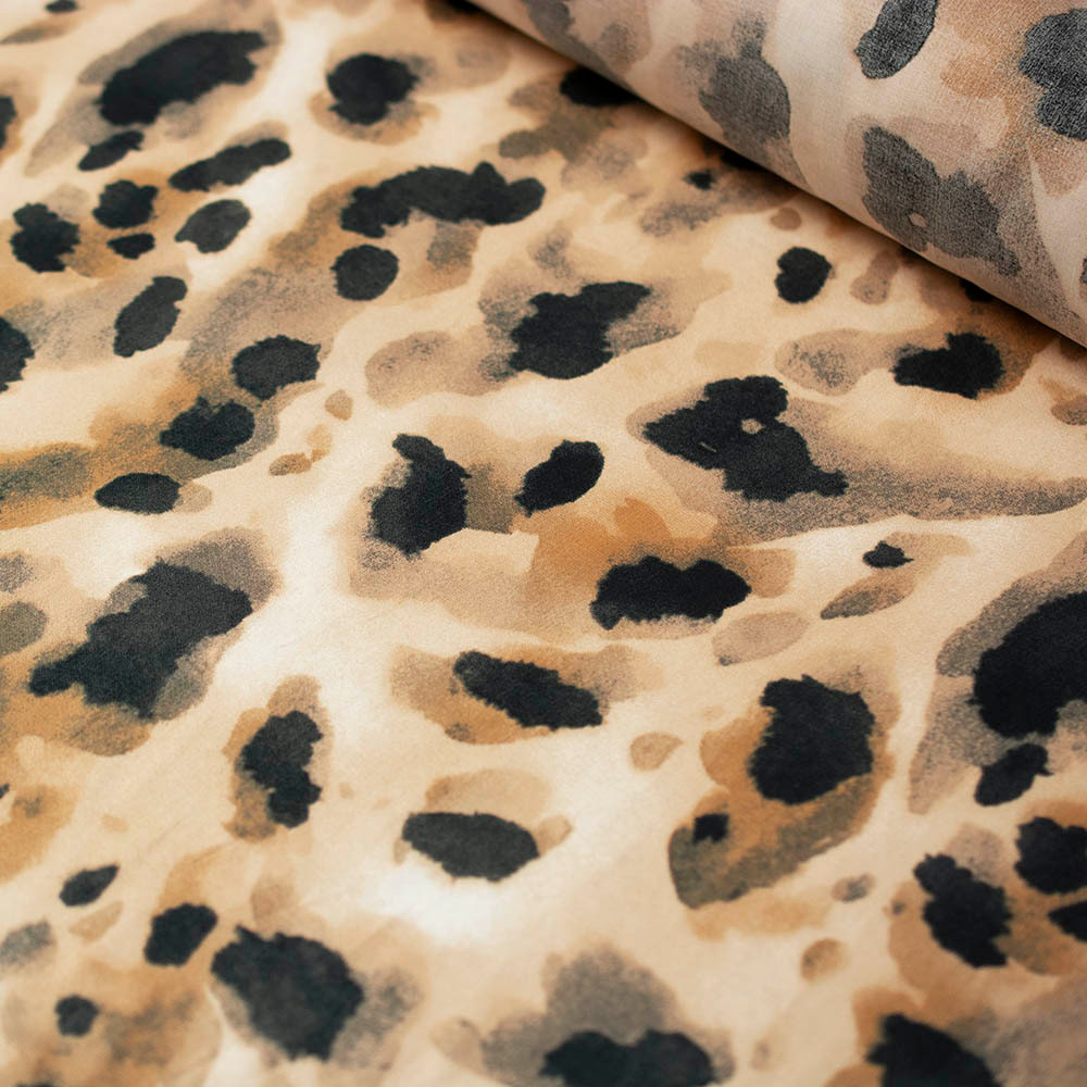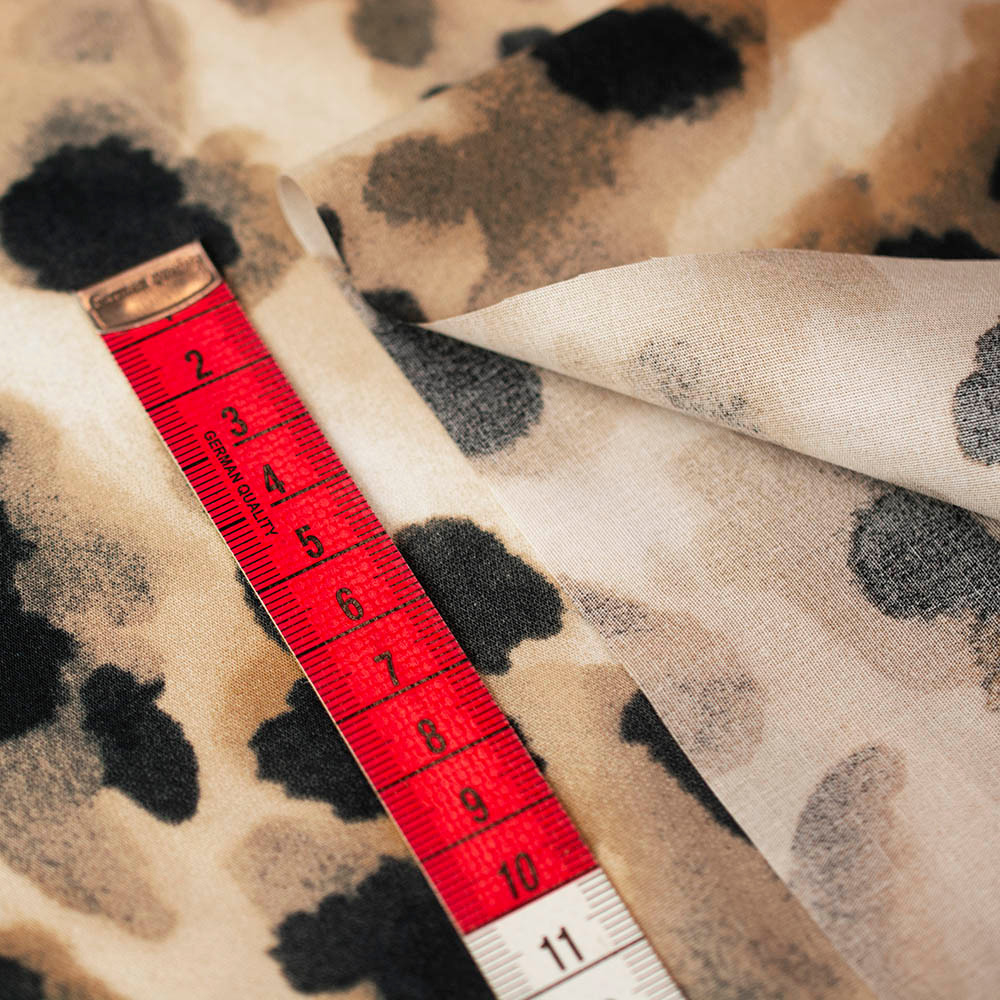 Bawełniana tkanina w ponadczasowy wzór panterki wyróżnia się miękkością i przyjemną w dotyku fakturą, zapewniając codzienny komfort noszenia.
