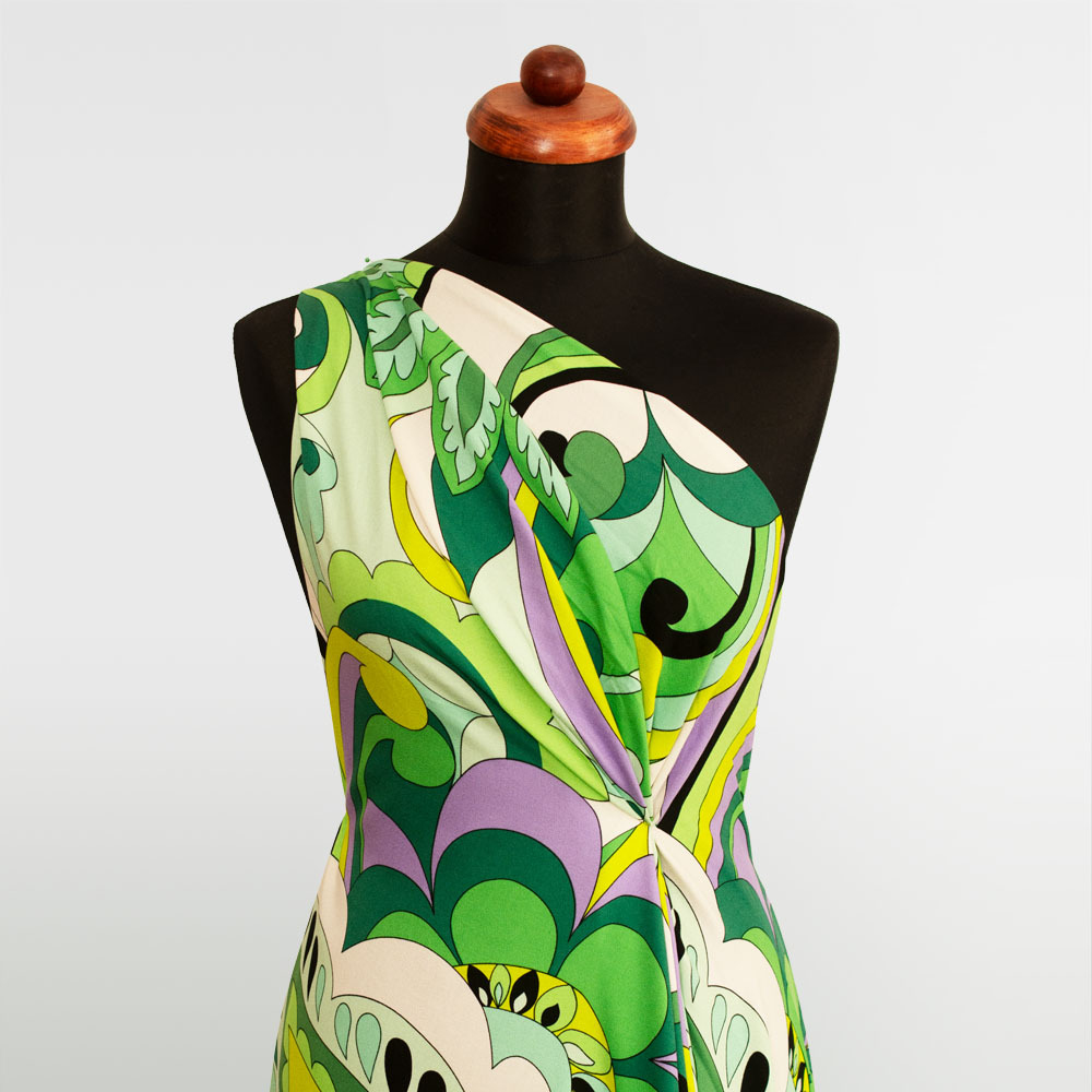 Lekka i zwiewna tkanina żorżetowa, wykonana włókien wiskozowych. Układa się miękko i lejąco, charakteryzuje się małą gniotliwością. Tkaninę wyróżnia wyraźny splot oraz nieregularna faktura, dzięki której wydaje się być bardziej lekka i zwiewna. Dodatkowo materiał zdobi bardzo modny wzór. Deseń świetnie sprawdzi się na bluzki, tuniki, sukienki czy spódnice.