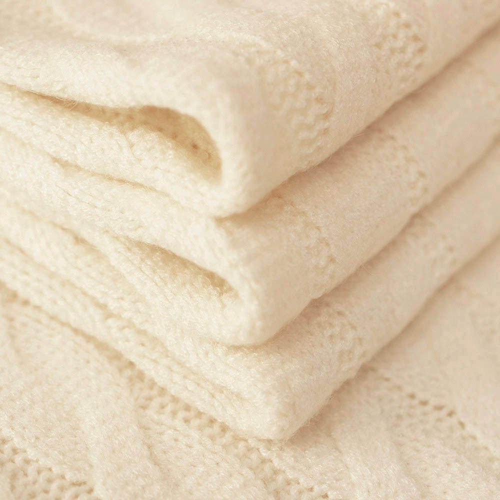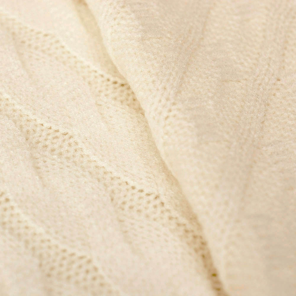 Swetrowa dzianina o efektownym splocie warkoczowym, wykonana z mieszanki włókien naturalnych i syntetycznych.