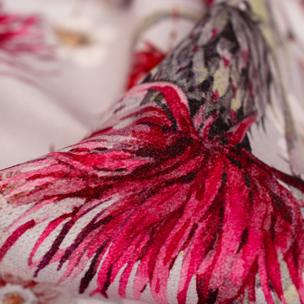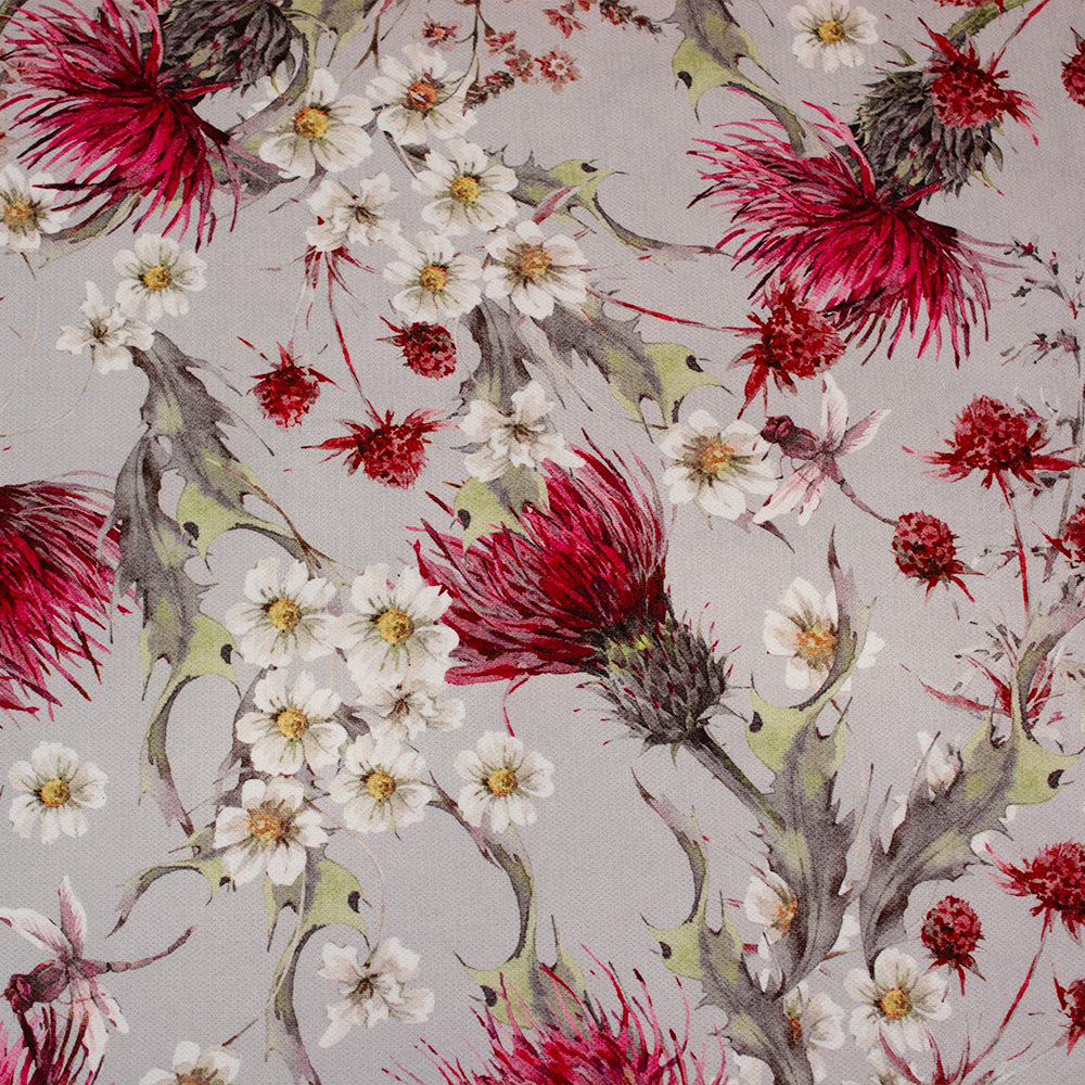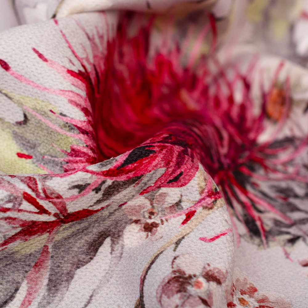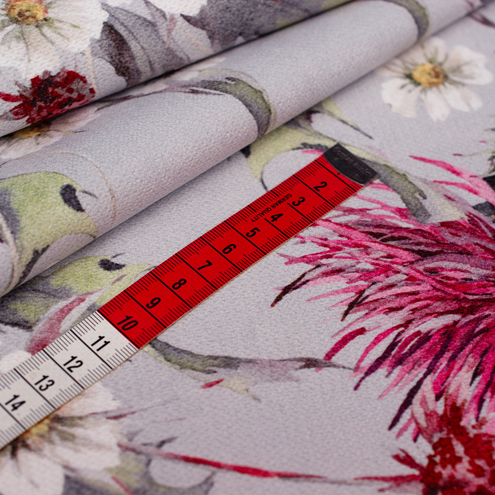 Wzorzysta tkanina dekoracyjna w elegancki kwiatowy wzór. Tkanina jest mocna a jednocześnie miękka i przyjemna w dotyku. Posiada szerokie zastosowanie, głównie sprawdzi się w dekoracji domu. Z tkaniny można oszyć ozdobne poduszki, zasłony, a także wykorzystać na obicia krzeseł.