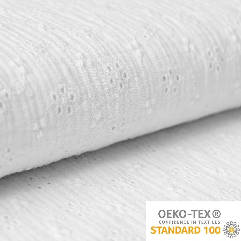 Haftowany muślin – bardzo przyjemna w dotyku tkanina, lekka o niskiej gramaturze. Składa się z dwóch bardzo cienkich warstw połączonych ze sobą. Dzięki temu tkanina nabiera charakterystycznej faktury oraz sprawia wrażenie bardziej mięsistej. Głównym atutem tkaniny jest haftowany wzór, który tworzy na powierzchni ażurowy deseń. Muśliny świetnie sprawdzają się dla dzieci i alergików. Są miękkie i nie podrażniają skóry. Wspaniale prezentują się na sukienkach, bluzkach, a także wszelkich akcesoriów dla niemowląt.