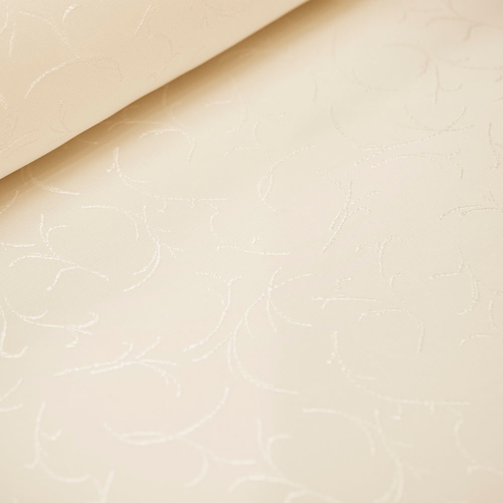 Tkanina obrusowa w kolorze ecru, wykonana z wysokiej jakości, mocno skręconych włókien poliestrowych, z dodatkiem metalicznej nici. Jest łatwo spieralna, posiada cechy plamoodporne. Doskonale nadaje się na stół, dekoracje i ozdoby.