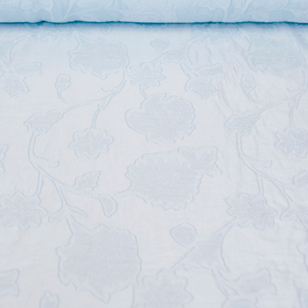 Tkanina z haftem kwiatowym wyróżnia się miękkością, lekkością i przyjemnym chwytem. Jej półtransparentna struktura dodaje projektom zwiewności, a jednokolorowy haft tworzy spójną, estetyczną powierzchnię. Materiał układa się naturalnie i zapewnia dobrą przewiewność, dzięki czemu świetnie sprawdza się w cieplejsze dni.