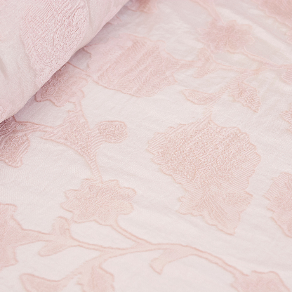 Tkanina z haftem kwiatowym wyróżnia się miękkością, lekkością i przyjemnym chwytem. Jej półtransparentna struktura dodaje projektom zwiewności, a jednokolorowy haft tworzy spójną, estetyczną powierzchnię. Materiał układa się naturalnie i zapewnia dobrą przewiewność, dzięki czemu świetnie sprawdza się w cieplejsze dni.