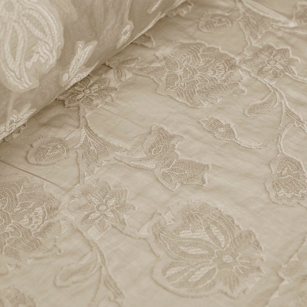 Tkanina z haftem kwiatowym wyróżnia się miękkością, lekkością i przyjemnym chwytem. Jej półtransparentna struktura dodaje projektom zwiewności, a jednokolorowy haft tworzy spójną, estetyczną powierzchnię. Materiał układa się naturalnie i zapewnia dobrą przewiewność, dzięki czemu świetnie sprawdza się w cieplejsze dni.