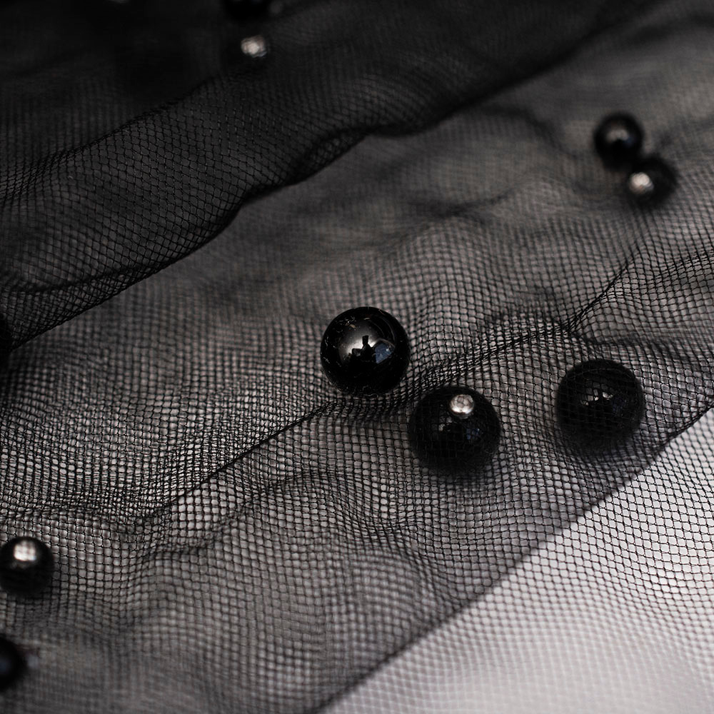 Tiul perełka, delikatna tkanina w formie siateczki. Tkanina jest lekka, efektowna, układa się miękko. Perły mocowane na nitach tworzą dekoracyjny, biżuteryjny akcent, dodając materiałowi elegancji. Tkanina świetnie sprawdzi się w kreacjach balowych, koktajlowych i innych wyjątkowych projektach. Może być również wykorzystana jako ozdobny dodatek lub wstawka, która podkreśli charakter stylizacji.