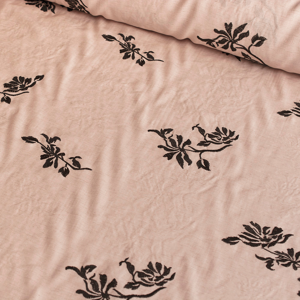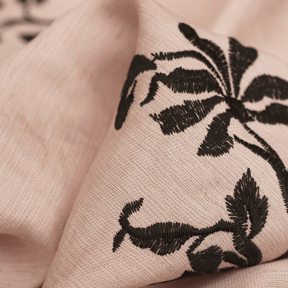 Tkanina z połączenia wiskozy i lnu z dekoracyjnym haftem wyróżnia się naturalną lekkością i subtelną elegancją.