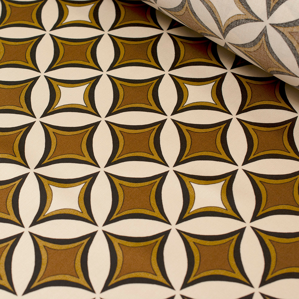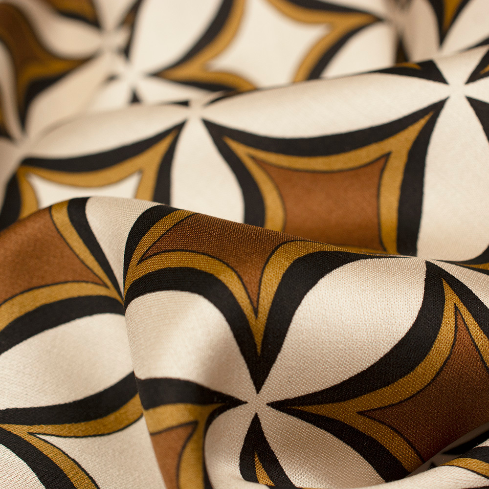 Wzorzysta tkanina wiskozowa o subtelnym, satynowym połysku.