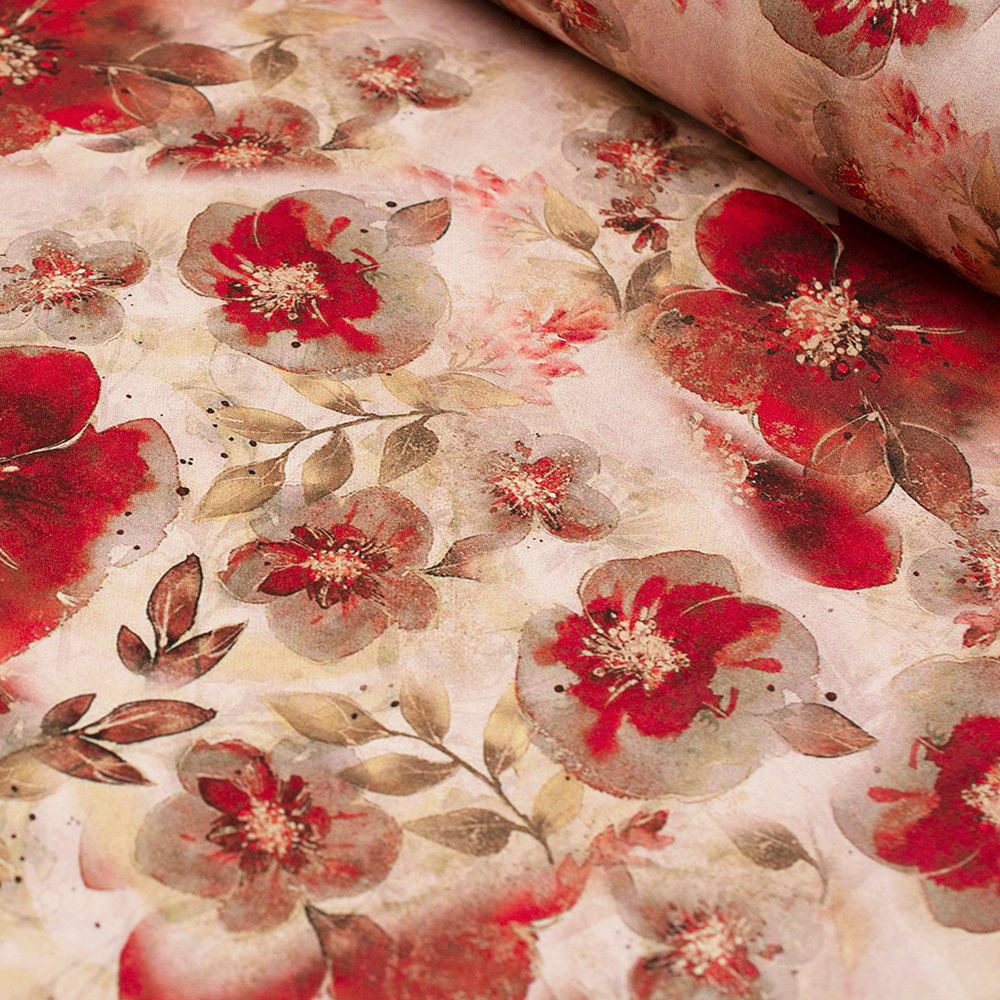 Wzorzysta tkanina wiskozowa o subtelnym, satynowym połysku.