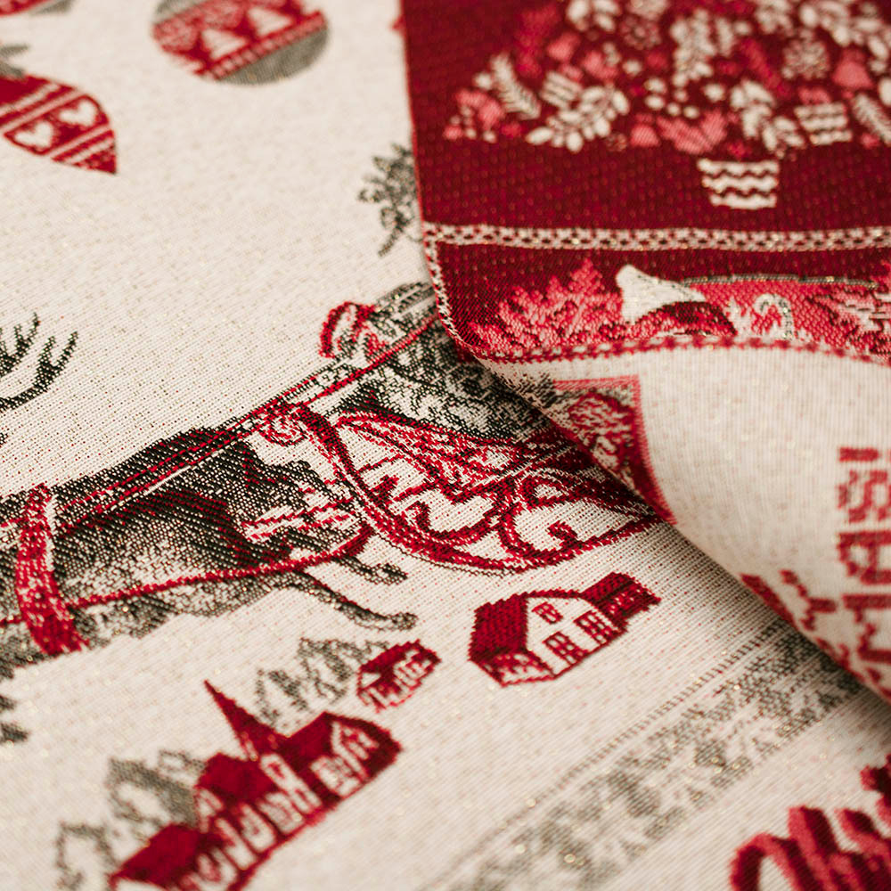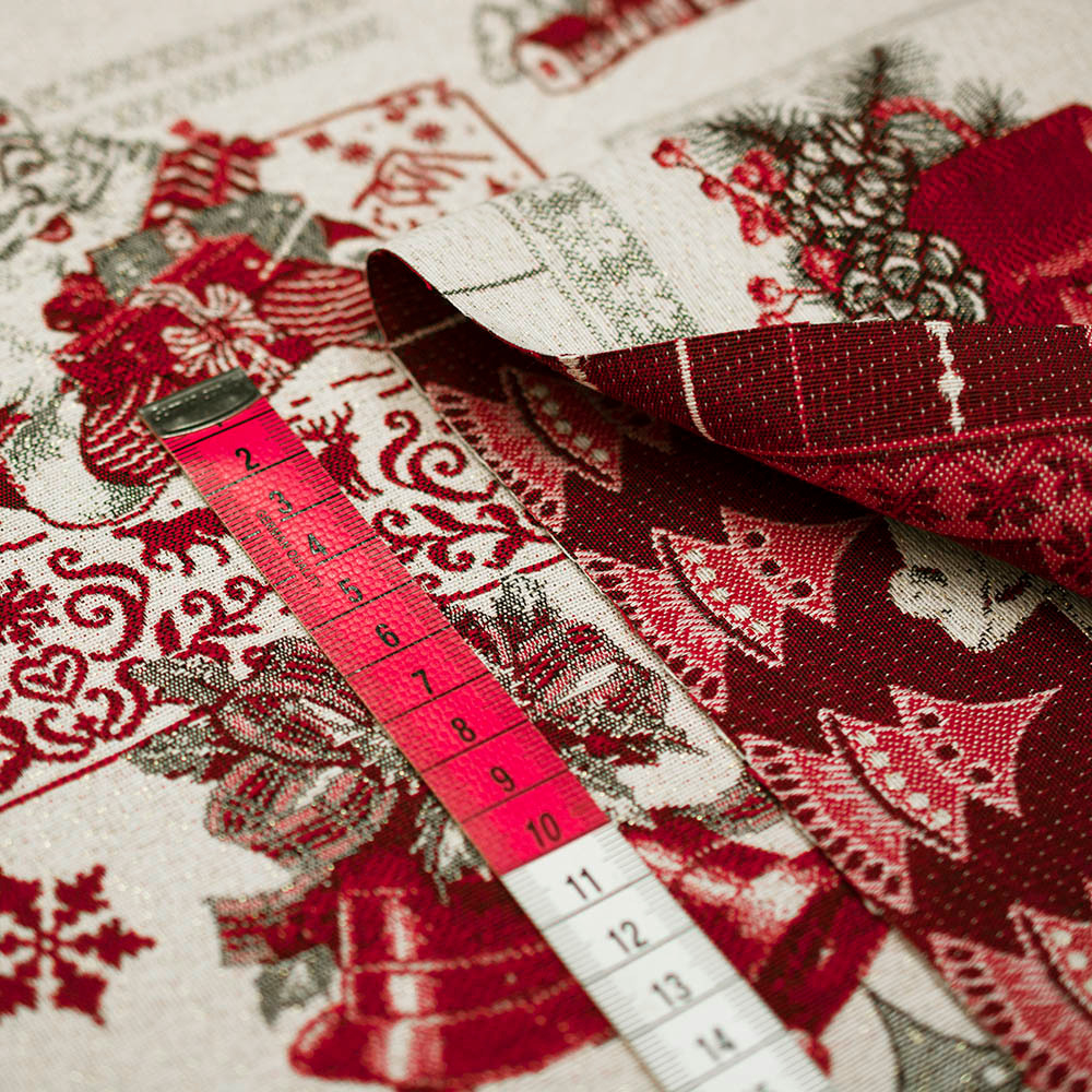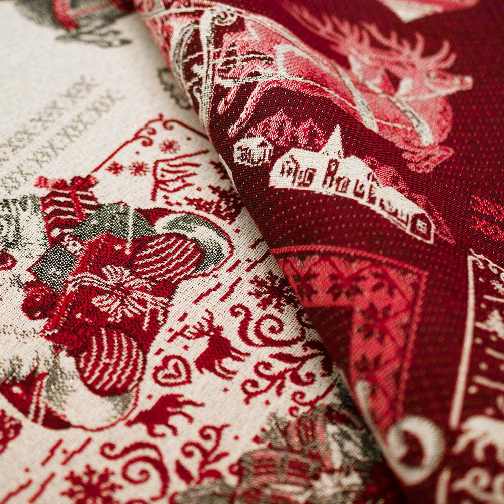 Wzorzysta tkanina dekoracyjna o pięknym, świątecznym deseniu to doskonały wybór do aranżacji wnętrz w okresie zimowym. Wykonana techniką żakardową, charakteryzuje się mocnym splotem oraz przyjemnie miękką fakturą, która dodaje tekstyliom elegancji i komfortu. Dzięki swojej wszechstronności świetnie sprawdzi się jako materiał na ozdobne poduszki, świąteczne obrusy czy bieżniki, wprowadzając do domu ciepły, uroczysty klimat.