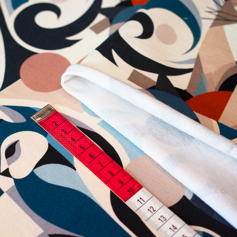 Dzianinę dodatkowo zdobi bardzo modny wzór wykonany za pomocą druku cyfrowego. Ta metoda pozwala na uzyskanie wielokolorowych deseni o trwałych i nasyconych barwach. Druk nie jest wyczuwalny w dotyku oraz nie wpływa na miękkość dzianiny.