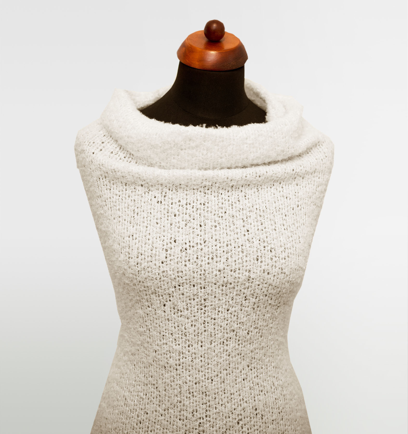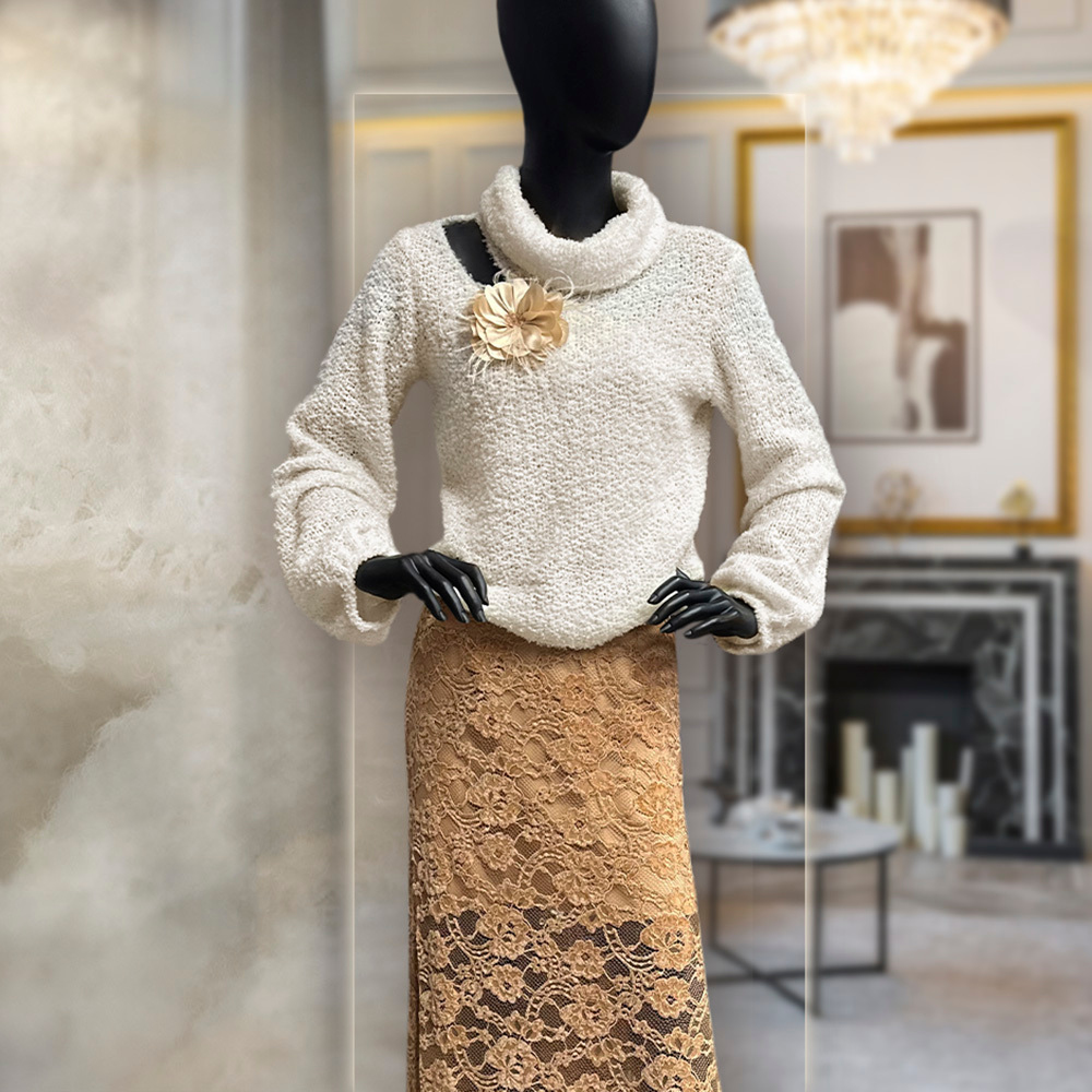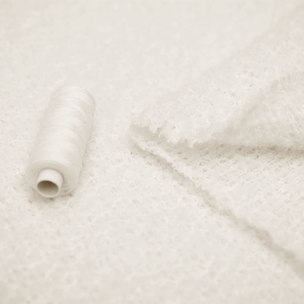 Delikatna dzianina swetrowa w jednolitym kolorze. Wyróżnia się ażurowym splotem oraz oryginalną fakturą nawiązującą do boucle. Dzianina jest bardzo przyjemna w dotyku, a jednocześnie niezwykle lekka. To świetna propozycja na chłodniejsze wiosenne i letnie wieczory, a także bardzo modny akcent obecnego sezonu. Idealnie sprawdzi się na golfy, swetry w typie oversize lub o przylegającym fasonie, bluzki i kamizelki.