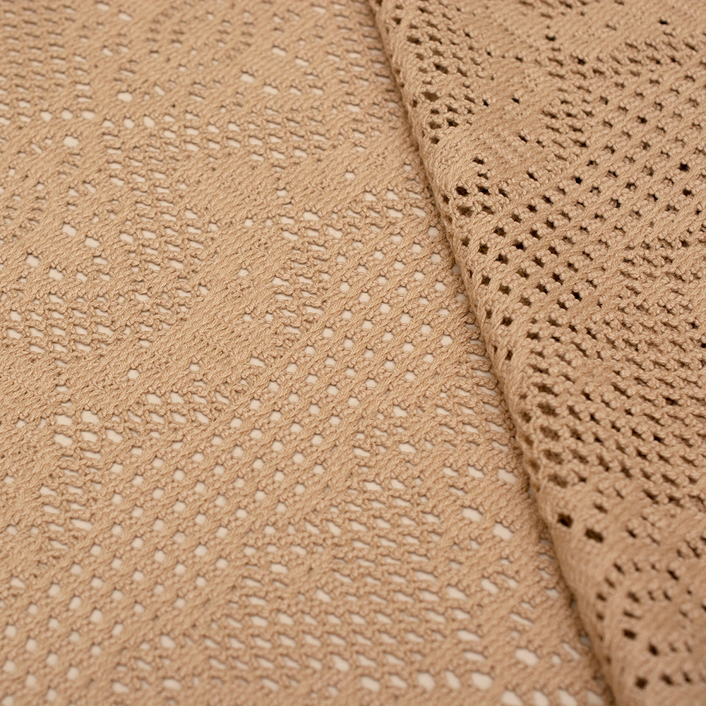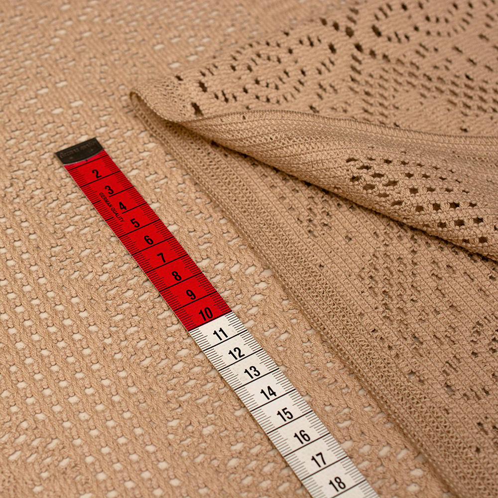 Ażurowa koronka z miękkiej, przyjemnej w dotyku bawełny o jednolitym kolorze. Pięknie prezentuje się na sylwetce, dodaje lekkości każdej stylizacji. Idealna na letnie projekty w estetyce Boho, Eko czy Natur. Doskonale sprawdzi się w sukienkach, spódnicach, bluzkach oraz narzutkach, a także jako efektowny detal, na przykład w formie torebki lub innych dodatków.