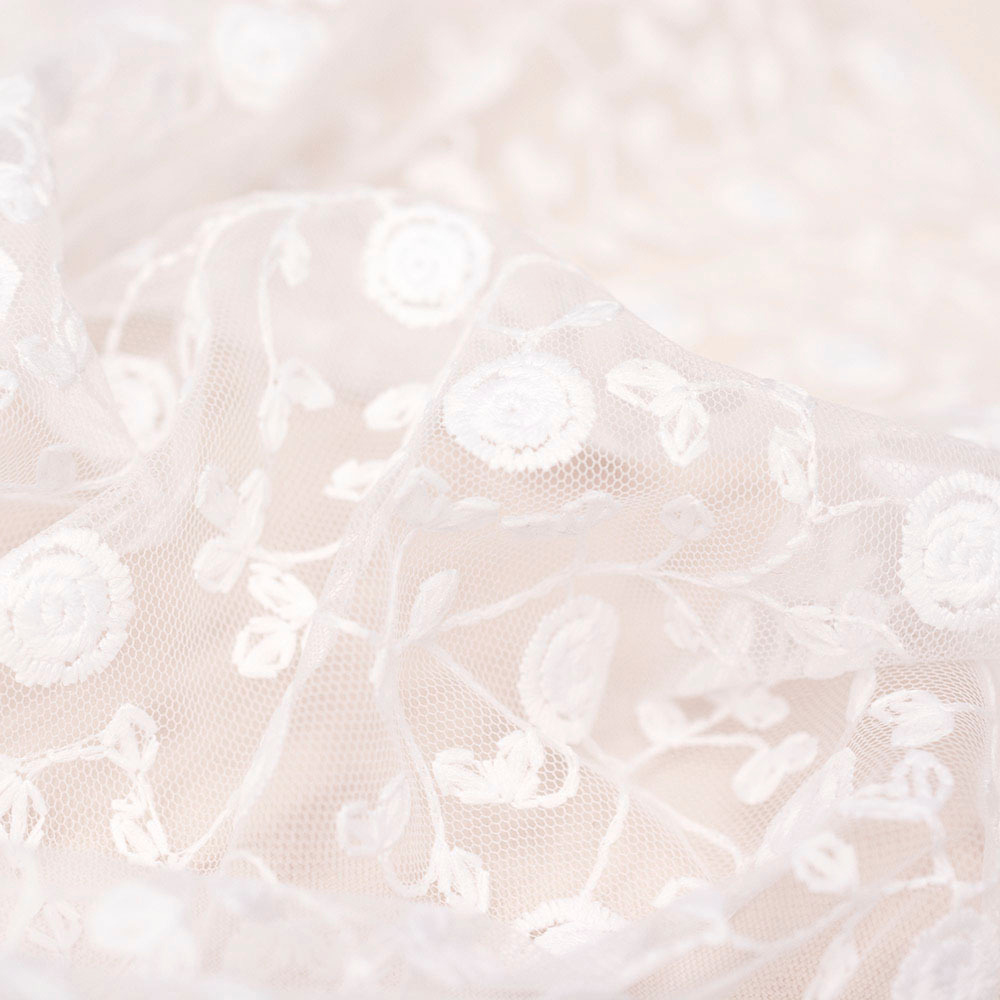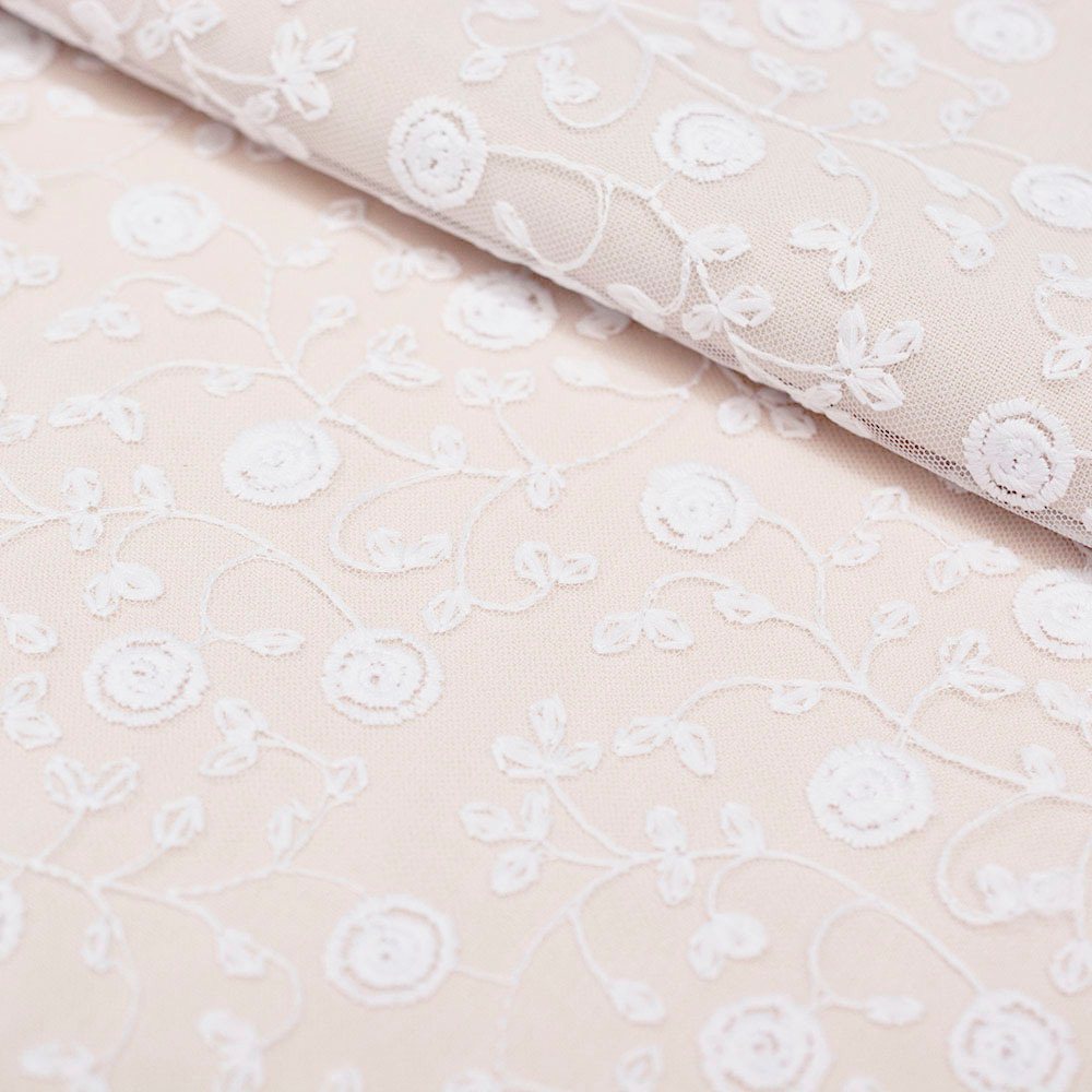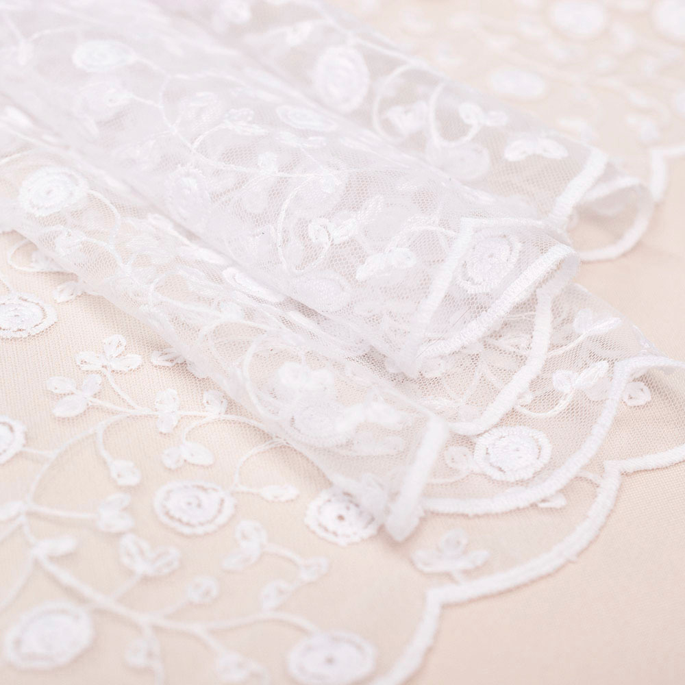 Elegancka koronka gipiurowa, wyróżnia się oryginalnym wzorem, który został wyhaftowany na tiulu.