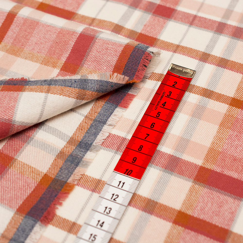 Miękka flanela wykonana z połączenia włókien bawełnianych i syntetycznych, w modnym wzorze kraty. Materiał jest przyjemny w dotyku, dobrze przepuszcza powietrze i cechuje się zwiększoną odpornością na uszkodzenia mechaniczne. Dwustronny wzór podnosi walory estetyczne i funkcjonalność tkaniny, umożliwiając wszechstronne zastosowanie. Doskonale sprawdza się w codziennej odzieży, szczególnie w koszulach, sukienkach o klasycznym kroju oraz modelach typu szmizjerka. Kraciasta spódnica uszyta z tej tkaniny to modny wybór, który idealnie wpisuje się w aktualne trendy.