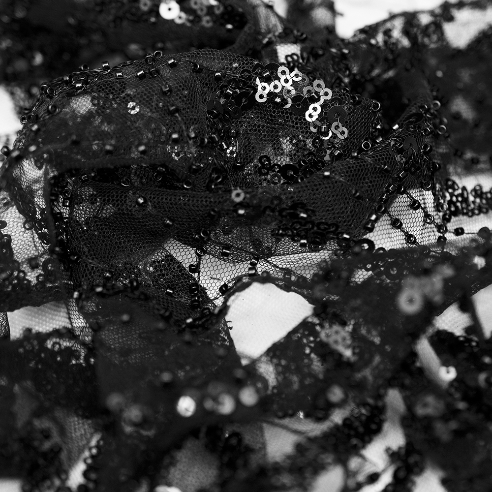 Zjawiskowa koronka z pięknym wzorem złożonch z cekinów i koralików, przyszytych na tiulowym spodzie. Rewelacyjnie sprawdzi się na suknie balowe, wieczorowe oraz ślubne. Bardzo szykownie będzie wyglądać na długich sukienkach, sukienkach koktajlowych lub eleganckich bluzkach. Tkanina posiada ażurowy splot, dla większego komfortu noszenia polecamy użyć dodatkowej tkaniny lub dzianiny w formie podszewki/podszycia. W tym celu świenite sprawdzi się Marchiano, Karelia, a także dzianina Super Jersey.