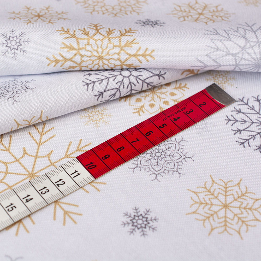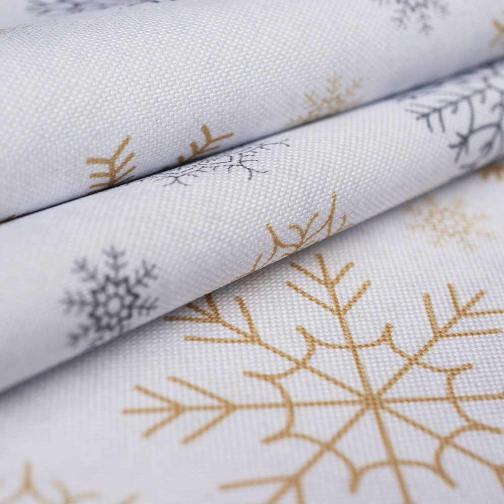 homeOUTLET /  KUPON 1.1 MB - TKANINA DEKORACYJNA OBRUSOWA ZŁOTE I SZARE ŚNIEŻYNKI