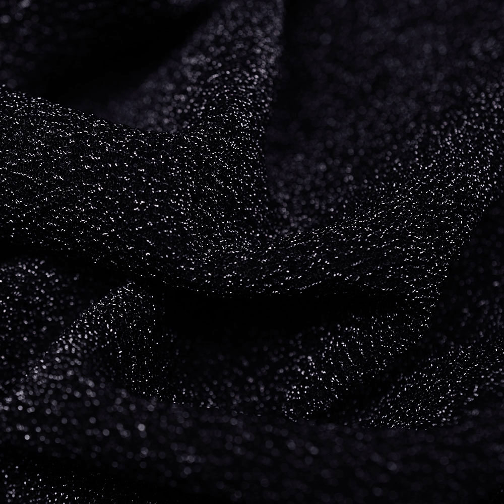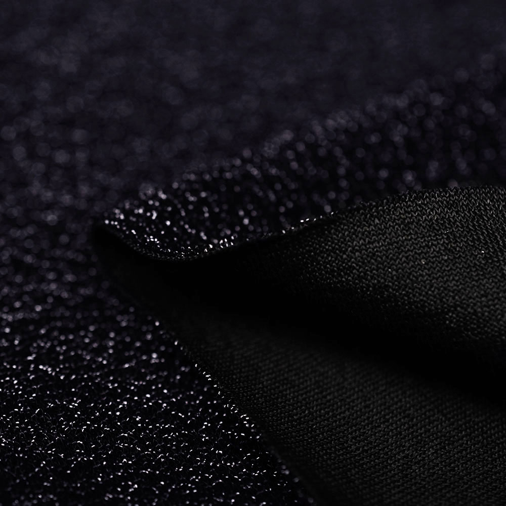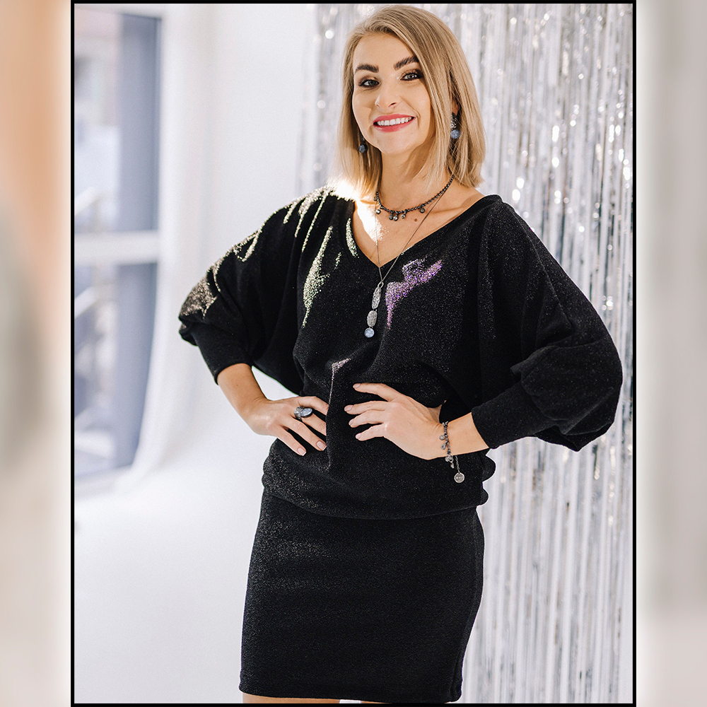 Elastyczna dzianina z dodatkiem nici metalicznej. Jest bardzo efektowna, i zjawiskowa, ładnie prezentuje się na sylwetce, szczególnie przy przylegających fasonach. Świetnie sprawdzi się na kreacje andrzejkowe, sylwestrowe, karnawałowe, balowe, a także na stroje taneczne. Dzianina jest bardzo dobra gatunkowo, lewa strona została zabezpieczona dodatkową warstwą materiału, przyjemną dla skóry. Dzięki temu uszyte kreacje nie wymagają użycia podszewki.
