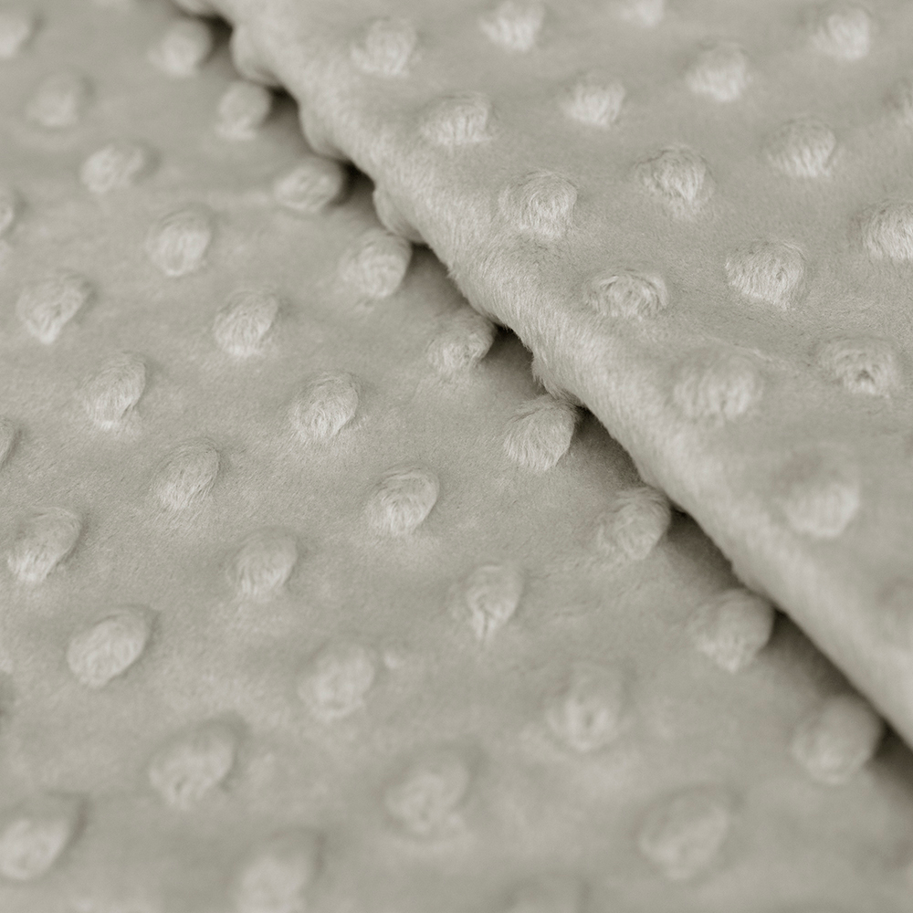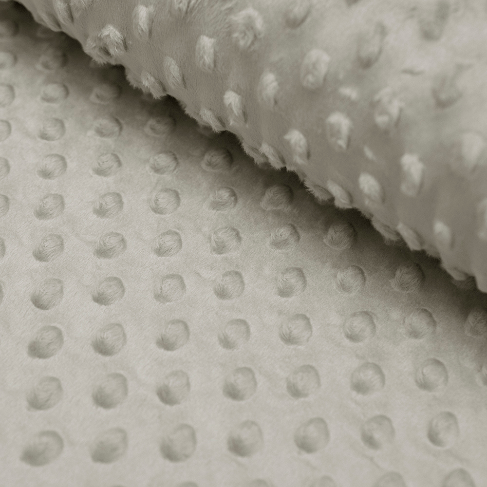 Minky Welur Kropki to bardzo popularna dzianina szczególnie wśród wyrobów dla dzieci. Dzianinę charakteryzuje krótki włos widoczny z prawej strony materiału, oraz tłoczenia w kształcie kropek, który dodaje materiałowi dużo uroku.