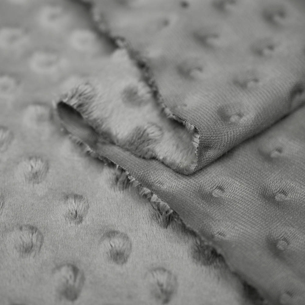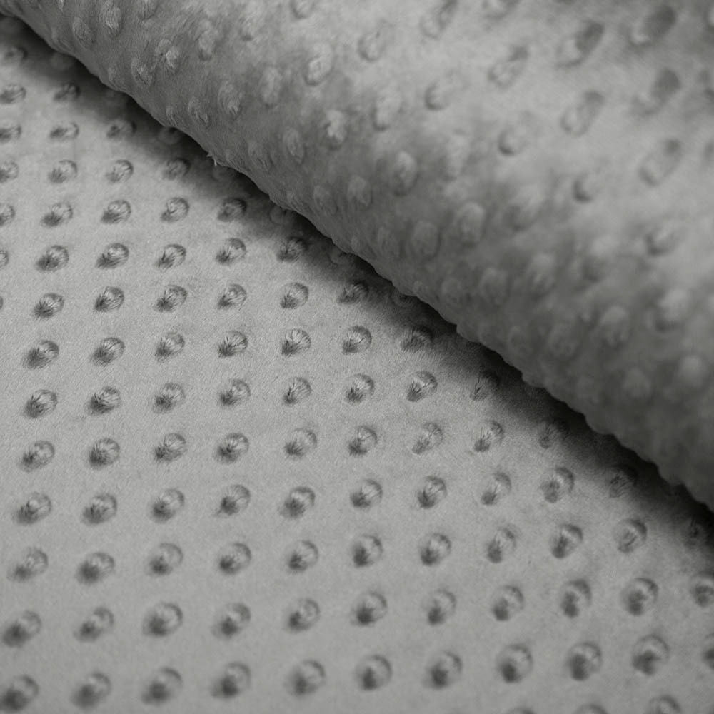 Minky Welur Kropki to bardzo popularna dzianina szczególnie wśród wyrobów dla dzieci. Dzianinę charakteryzuje krótki włos widoczny z prawej strony materiału, oraz tłoczenia w kształcie kropek, który dodaje materiałowi dużo uroku.