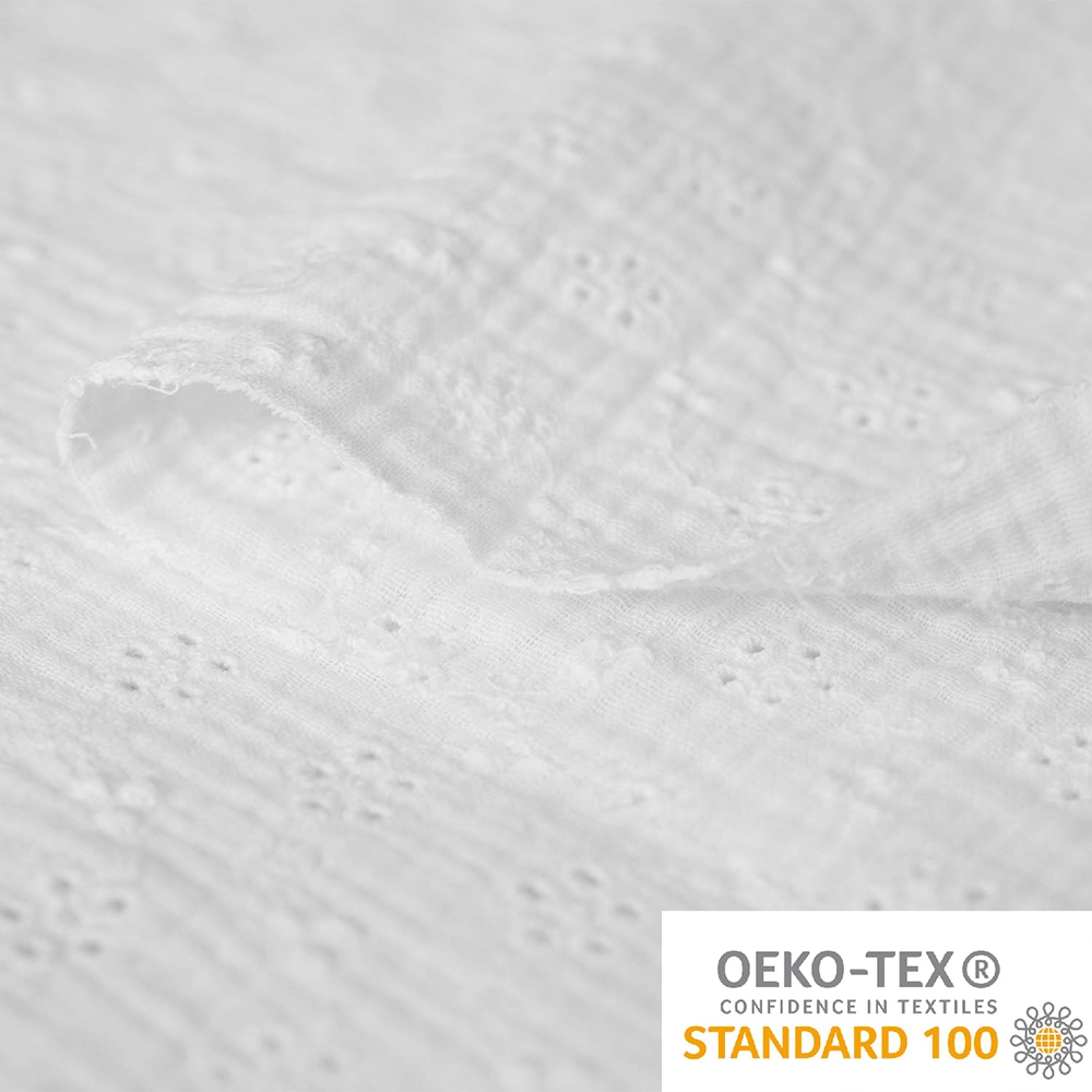 Haftowany muślin – bardzo przyjemna w dotyku tkanina, lekka o niskiej gramaturze. Składa się z dwóch bardzo cienkich warstw połączonych ze sobą. Dzięki temu tkanina nabiera charakterystycznej faktury oraz sprawia wrażenie bardziej mięsistej. Głównym atutem tkaniny jest haftowany wzór, który tworzy na powierzchni ażurowy deseń. Muśliny świetnie sprawdzają się dla dzieci i alergików. Są miękkie i nie podrażniają skóry. Wspaniale prezentują się na sukienkach, bluzkach, a także wszelkich akcesoriów dla niemowląt.
