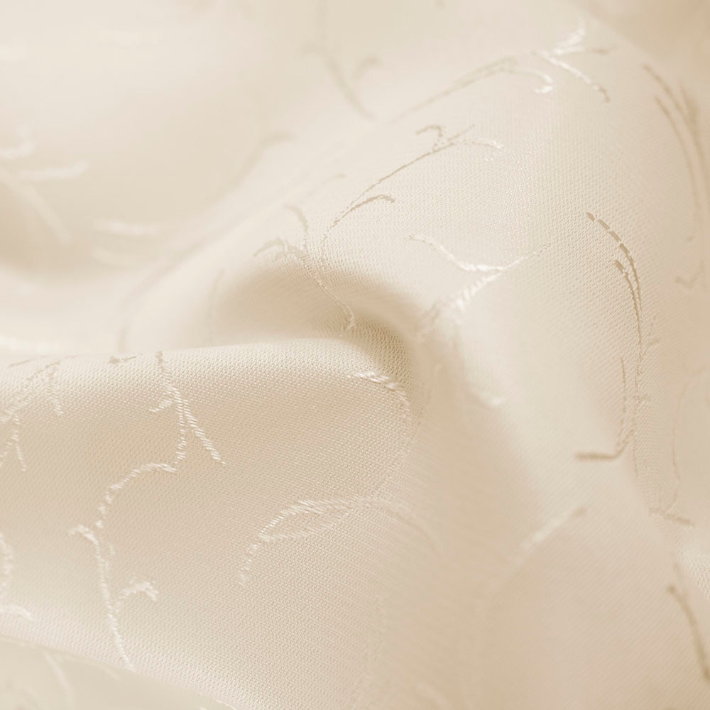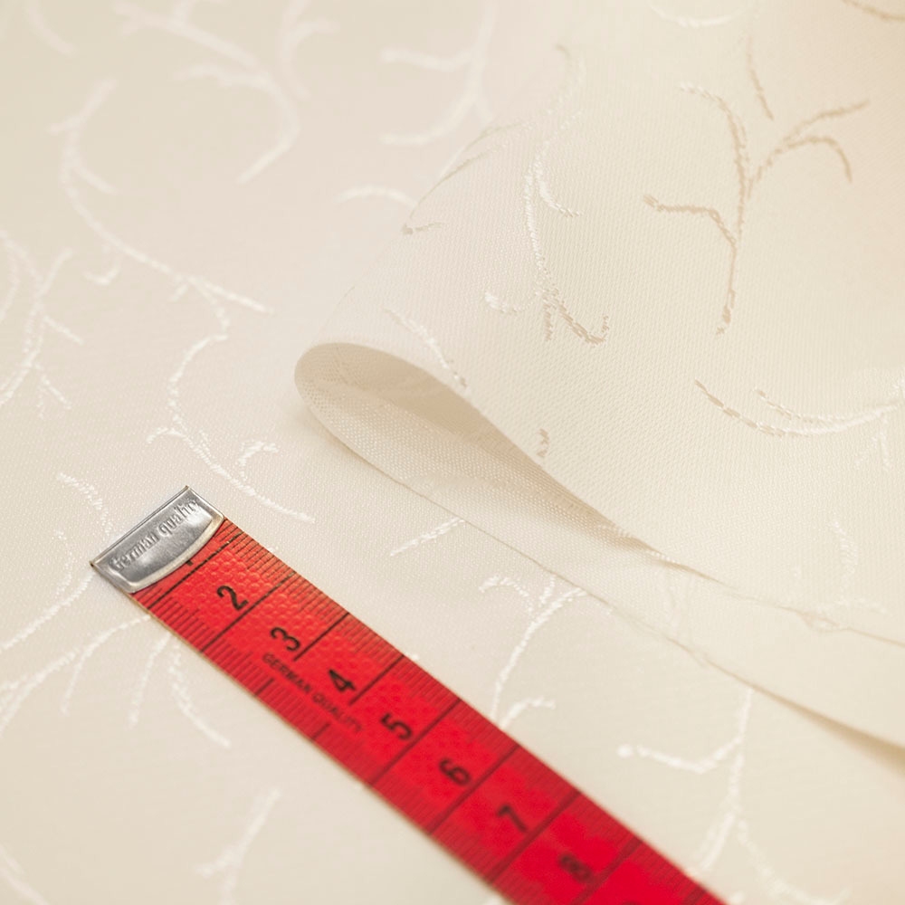 Tkanina obrusowa w kolorze ecru, wykonana z wysokiej jakości, mocno skręconych włókien poliestrowych, z dodatkiem metalicznej nici. Jest łatwo spieralna, posiada cechy plamoodporne. Doskonale nadaje się na stół, dekoracje i ozdoby.