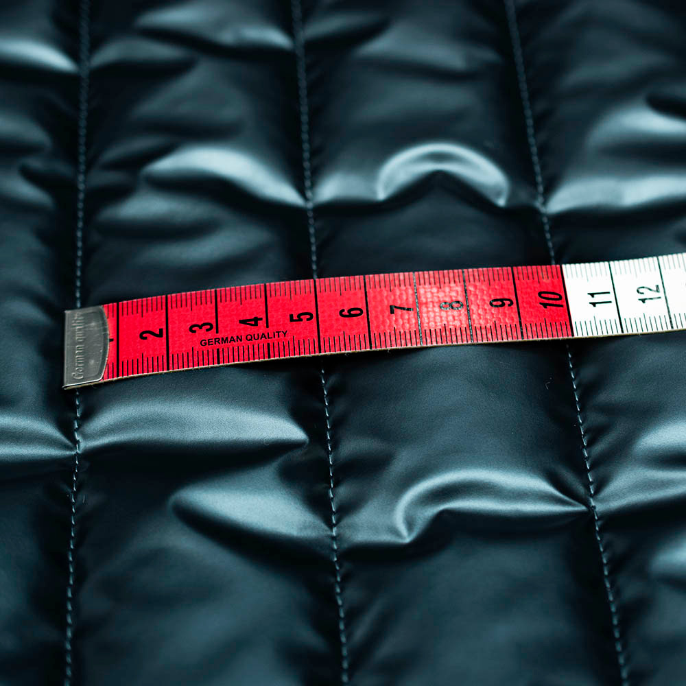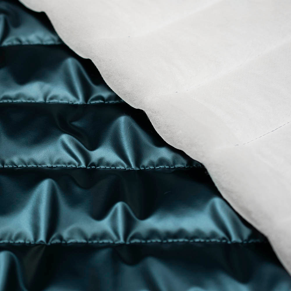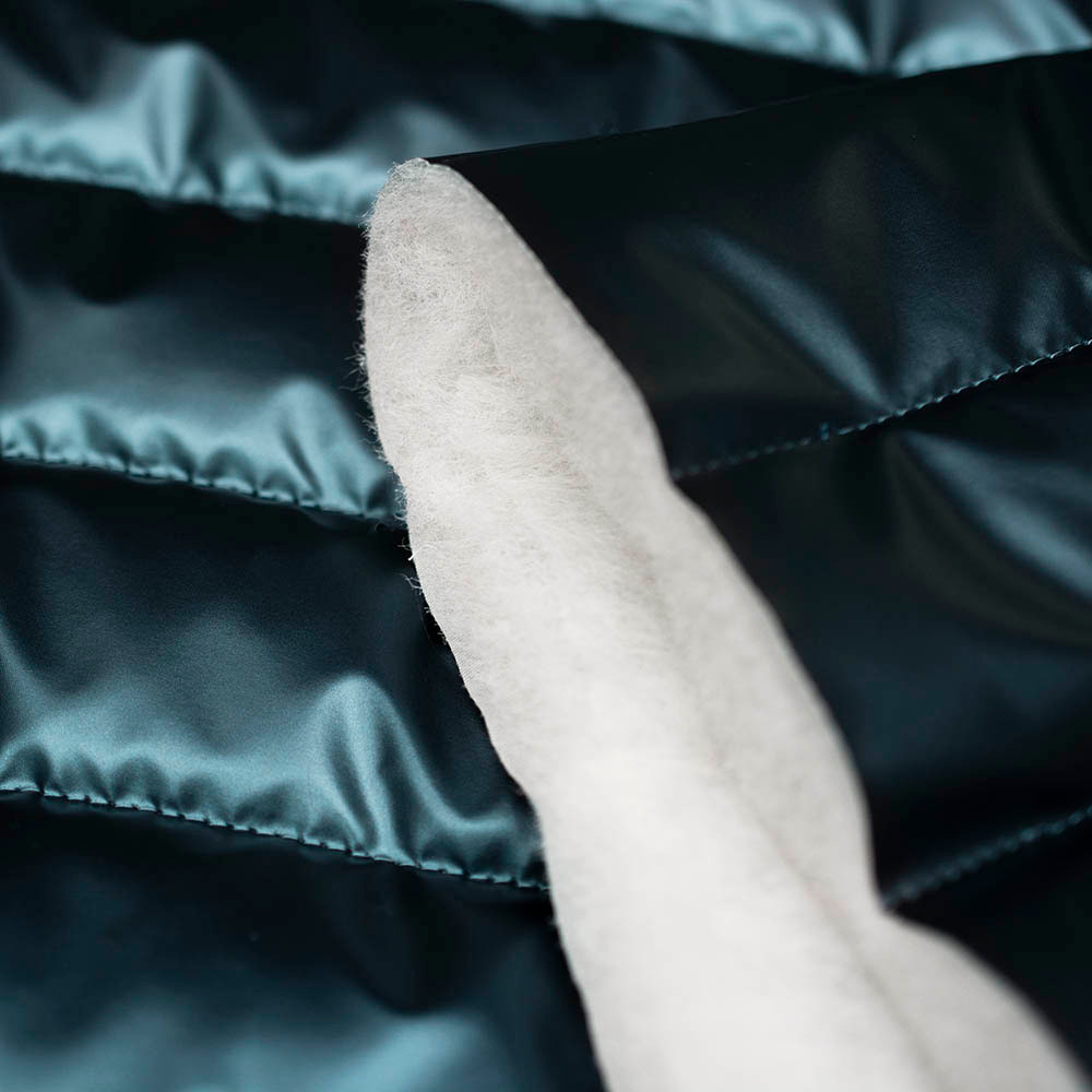 Warstwa zewnętrzna to cienki ortalionowy materiał o właściwościach wodoodpornych, drugą warstwę stanowi ocieplacz o grubości 150g/m2, i trzecia warstwa zabezpieczająca – flizelina. Tkanina jest lekka, a jednocześnie ciepła, zapewnia odpowiedni komfort w użytkowaniu. Jej dodatkowy atut stanowi tradycyjne pikowanie tzw. stebnówką, która tworzy na materiale pasy o szerokości 5 cm.