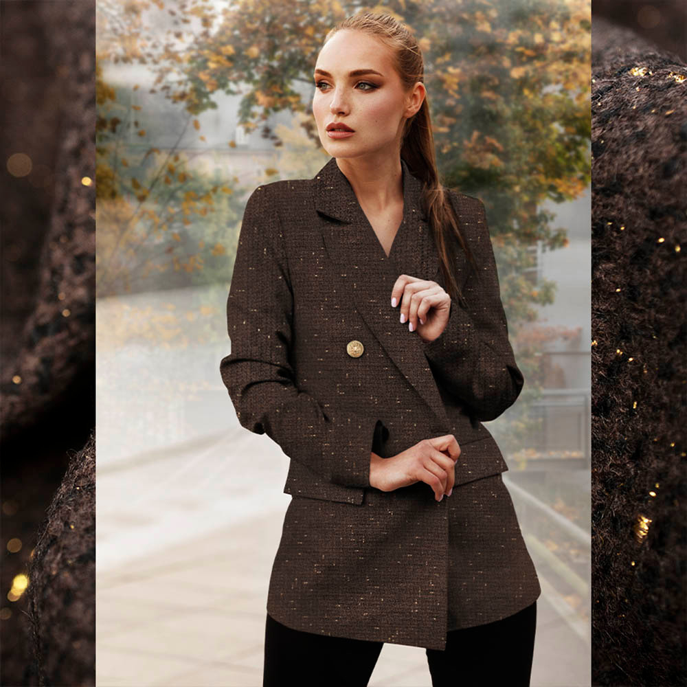 Tkanina Chanel o wyjątkowo eleganckim charakterze została subtelnie wzbogacona złotą nitką, która nadaje jej dyskretny, szlachetny blask. Miękka i przyjemna w dotyku, zachwyca komfortem noszenia oraz wyrafinowanym wyglądem. Doskonale sprawdza się w projektach żakietów, sukienek i spódniczek, podkreślając ich klasyczny, a zarazem nowoczesny styl. Świetnie odnajduje się w kolekcjach premium, gdzie liczy się wyrazistość i ponadczasowy szyk. To materiał, który wnosi do każdej stylizacji nutę paryskiej elegancji.