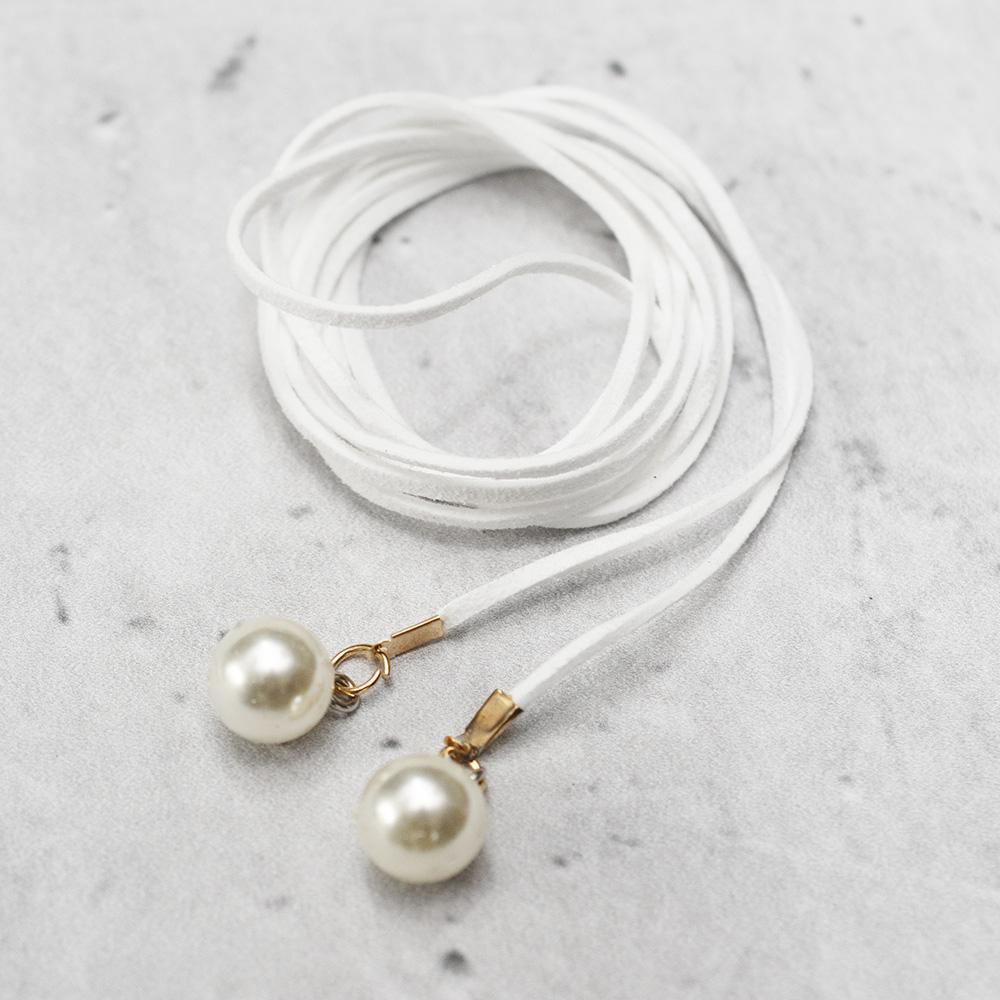 Ozdobny sznurek wykonany z białego rzemyka, zakończony z oby stron perłą. Świetnie nadaje się do wykończenia odzieży, jako element ozdobny, np. w formie paska, lub także w charakterze biżuterii.
