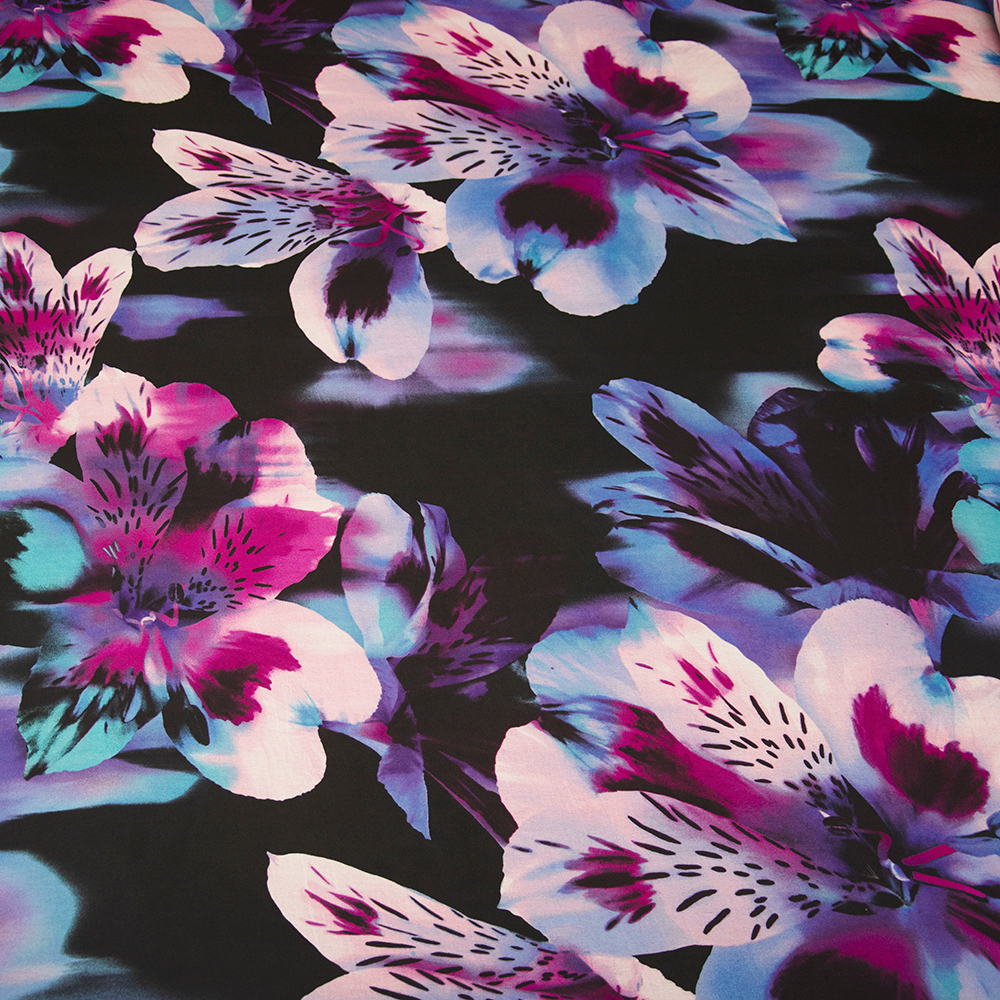 Lekka tkanina szyfonowa o delikatnej, żorżetowej fakturze. Tkanina układa się zwiewnie, miękko opływa ciało. Ze względu na swoją transparentność tkanina wymaga dodatkowego podszycia. Szyfon wyróżnia się pięknym i oryginalnym wzorem. Deseń idealnie wpisuje się w aktualne trendy modowe, świetnie się sprawdzi zarówno w noszeniu na co dzień, jak i na specjalne okazje.