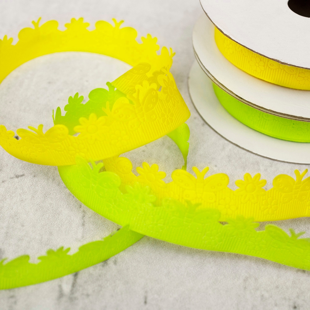 Dekoracyjna taśma satynowa z tłoczonym, wiosennym wzorem. Taśma jest w jednolitym kolorze, idealnie się nada na wszelkiego rodzaje dekoracje i ozdoby.