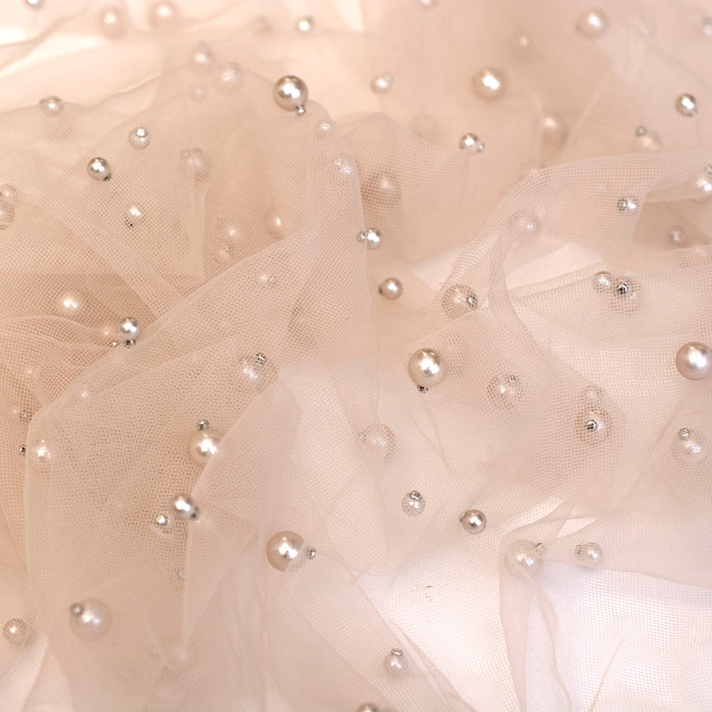 Tiul perełka, delikatna tkanina w formie siateczki. Tkanina jest lekka, efektowna, układa się miękko. Perły mocowane na nitach tworzą dekoracyjny, biżuteryjny akcent, dodając materiałowi elegancji. Tkanina świetnie sprawdzi się w kreacjach balowych, koktajlowych i innych wyjątkowych projektach. Może być również wykorzystana jako ozdobny dodatek lub wstawka, która podkreśli charakter stylizacji.