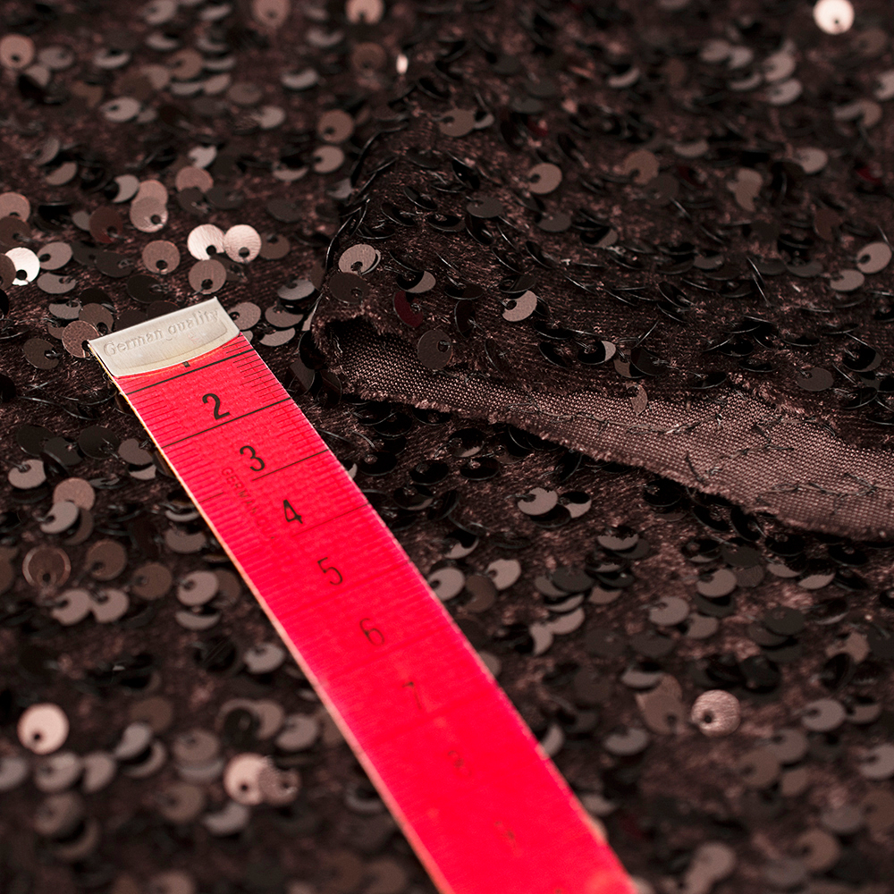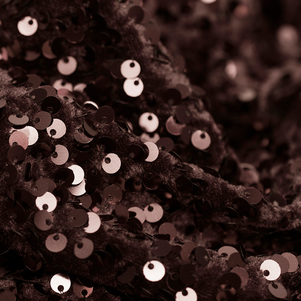 Efektowna dzianina welurowa ozdobiona nieregularnie rozmieszczonymi cekinami zachwyca oryginalnym wyglądem i wyjątkowym blaskiem.