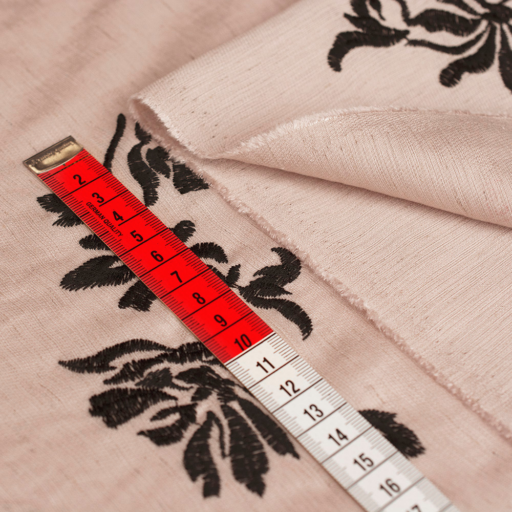Tkanina z połączenia wiskozy i lnu z dekoracyjnym haftem wyróżnia się naturalną lekkością i subtelną elegancją.