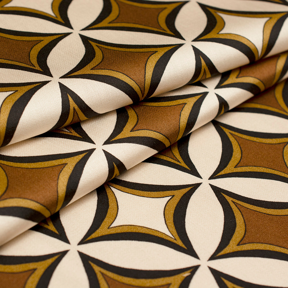 Wzorzysta tkanina wiskozowa o subtelnym, satynowym połysku.