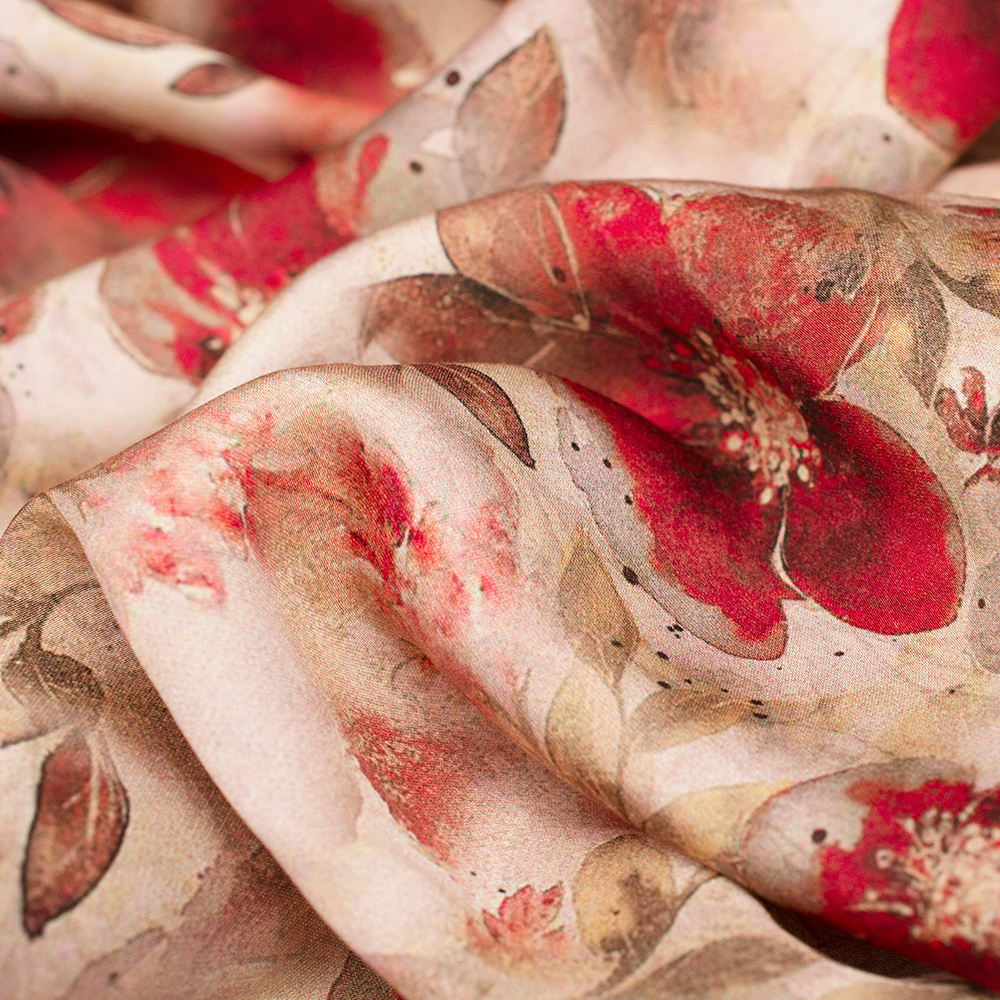 Wzorzysta tkanina wiskozowa o subtelnym, satynowym połysku.